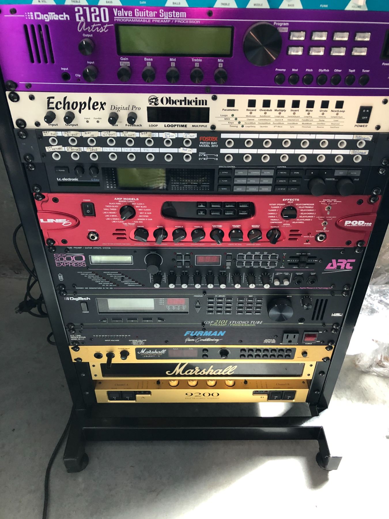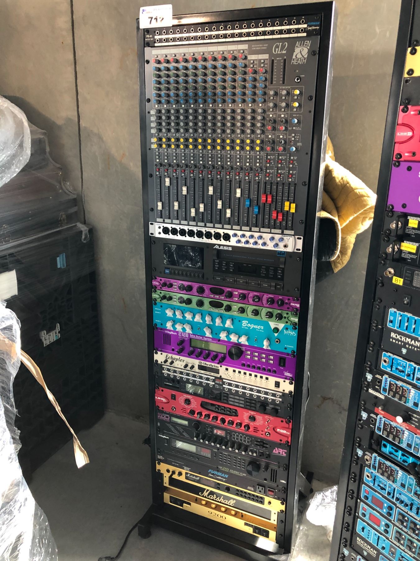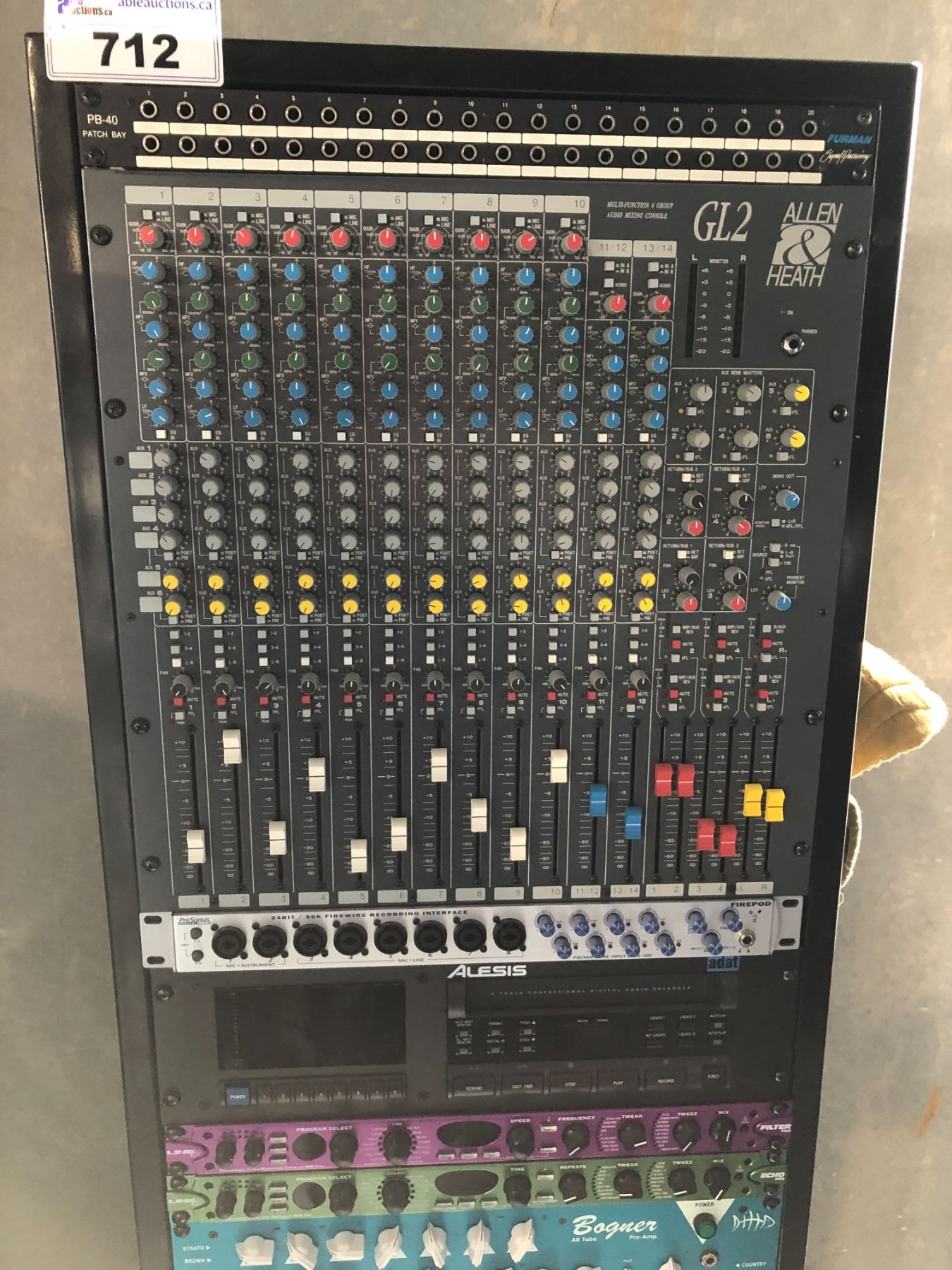 AV COMPONENT RACK WITH ALLEN & HEATH GL2 MULTI-FUNCTION 4 GROUP AUDIO MIXING CONSOLE, PRESONUS FIREPOD, ALESIS ADAT 8 TRACK, LINE 6 FILTER PRO, ECHO PRO, POD PRO BOGNER ALL TUBE PRE-AMP, DIGITECH 2120 ARTIST PROGRAMMABLE PREAMP/PROCESSOR, OBERHEIM ECHOPLEX, TC ELECTRONIC G-FORCE, ART SGX2000 , EXPRESS EFFECTS SYSTEM, DIGITECH GSP 2101 STUDIO TUBE , FURMAN POWER CONDITIONER, MARSHALL 9200 DUAL MONOBLOC AMP, VALVE MIDI PRE AMP JMP1, FOSTEX 3013 PATCH BAY AND FURMAN PB-40 PATCH BAY