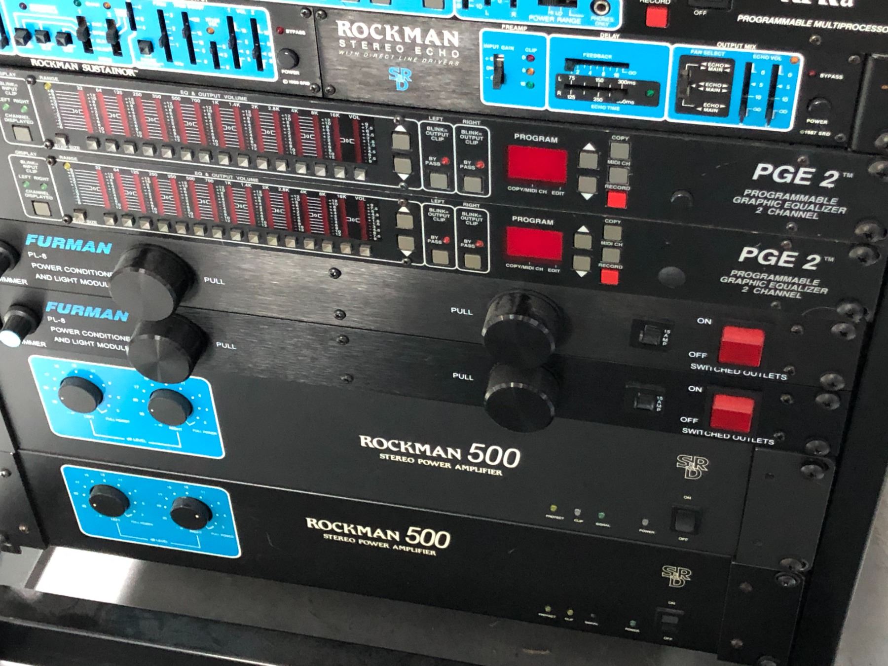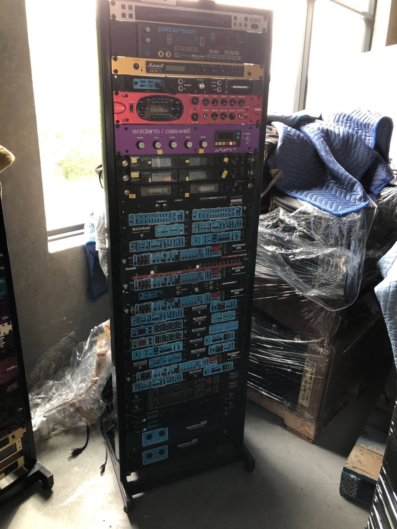 AV COMPONENT RACK WITH KORG TONEWORKS DTR-1 DIGITAL TUNER, MARSHALL JFX-1 SIGNAL PROCESSOR, ROCKMOUNT SWITCH, LINE 6 POD XT PRO, SOLDANO/CASWELL SWITCH, GROUND CONTROL GCX GUITAR AUDIO SWITCHER, EQ, SMART GATE, SUSTAINER, CHORUS/DELAY, XPR MULTI PROCESSORS, DISTORTION GENERATORS, 3 BAND GATES, EFFECTS LOOP, ECHOS, XPRA MULTI PROCESSOR, 2 TOM SHOLTZ PG2 2 CHANNEL EQS, 2 FURMAN PL-8 POWER CONDITIONERS , 2 ROCKMAN 500 POWER AMPLIFIERS, ROCKTRON PATCHMATE AND PETERSON MODEL 590 TUNER, 2 SHURE UR4D RECEIVERS, , MIDI OCTOPUS, AND SHURE UHF