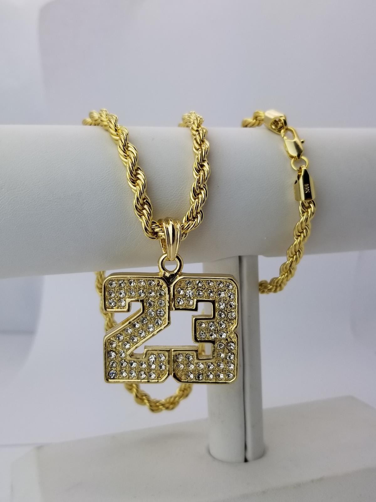 AWESOME 14 Kt. GOLD PLATED ROPE CHAIN PENDANT.This Commemorative Michael Jordan Number 23 Pendant Looks As Great As He Played. The Pendant Is On A 3 mm. 30 inch Long14 Kt Gold Plated Chain.39 Total Gram Wt.