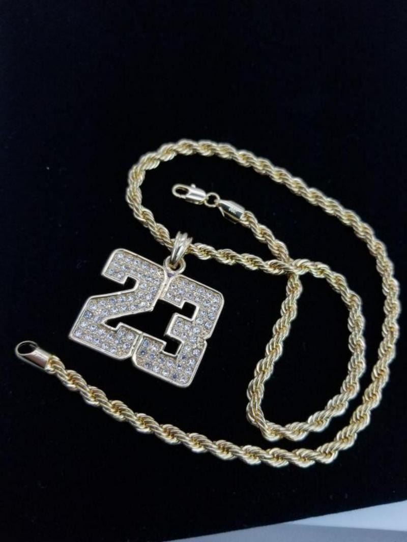 AWESOME 14 Kt. GOLD PLATED ROPE CHAIN PENDANT.This Commemorative Michael Jordan Number 23 Pendant Looks As Great As He Played. The Pendant Is On A 3 mm. 30 inch Long14 Kt Gold Plated Chain.39 Total Gram Wt.