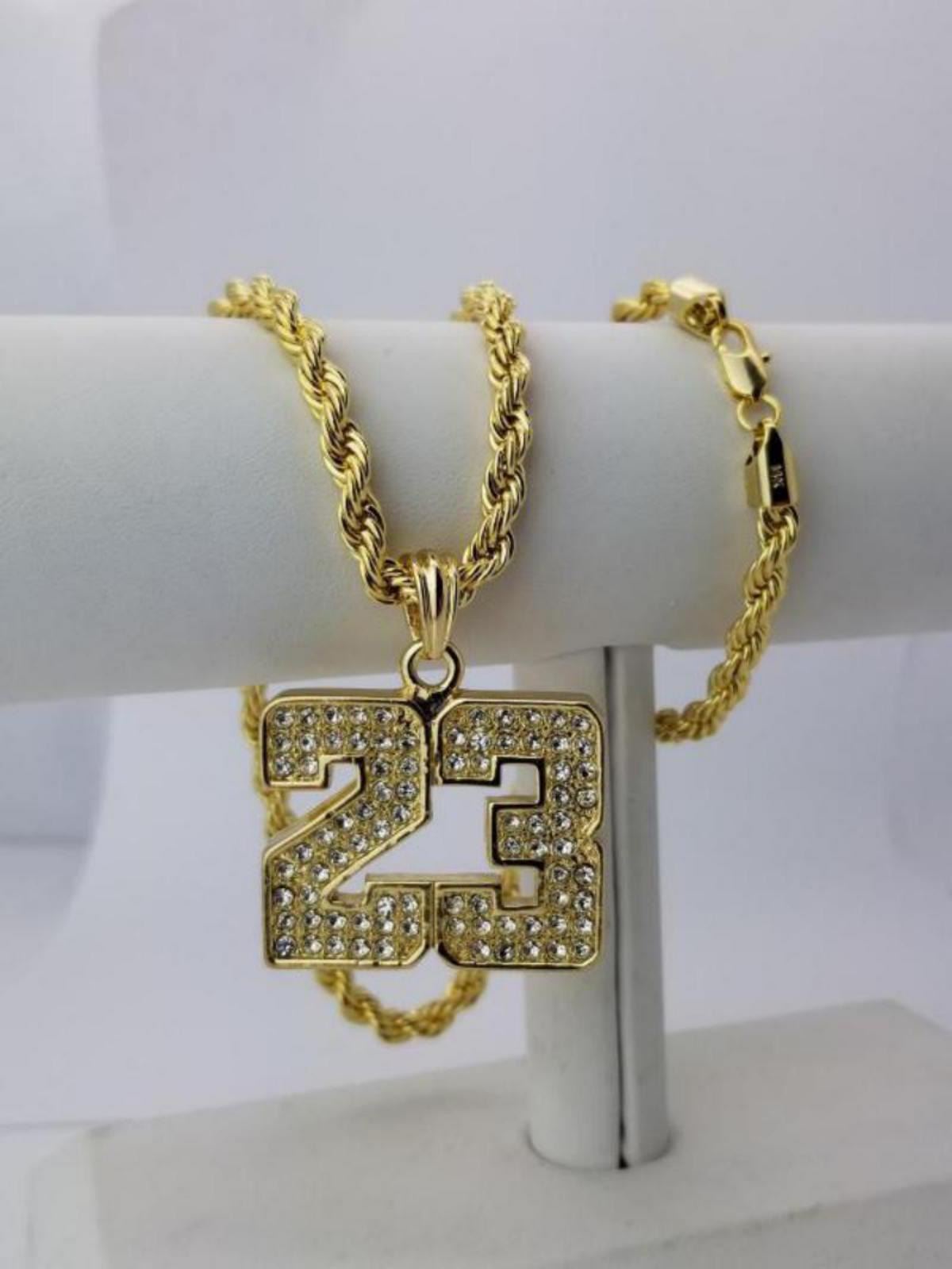 AWESOME 14 Kt. GOLD PLATED ROPE CHAIN PENDANT.This Commemorative Michael Jordan Number 23 Pendant Looks As Great As He Played. The Pendant Is On A 3 mm. 30 inch Long14 Kt Gold Plated Chain.39 Total Gram Wt.