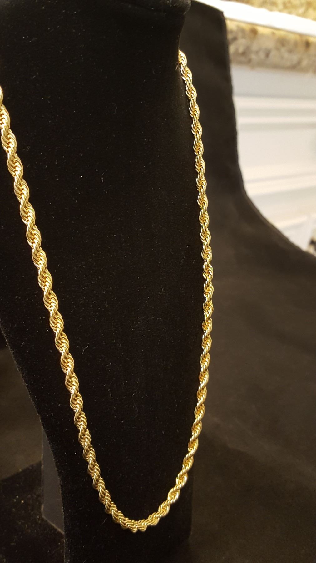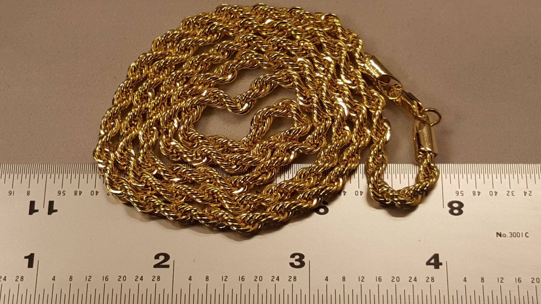 AWESOME 14 Kt. GOLD PLATED ROPE CHAIN.THIS CHAIN IS 24" LONG AND 3 mm. THICK. APPROX 23 GRAMS. SHOWS LIKE SOLID GOLD WITHOUT THE SOLID GOLD PRICE. GET READY FOR THE COMPLIMENTS ON THIS ONE.