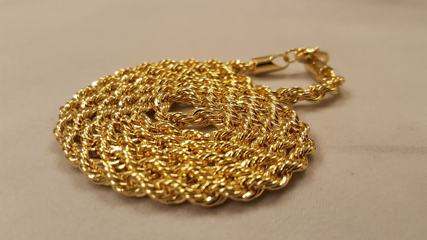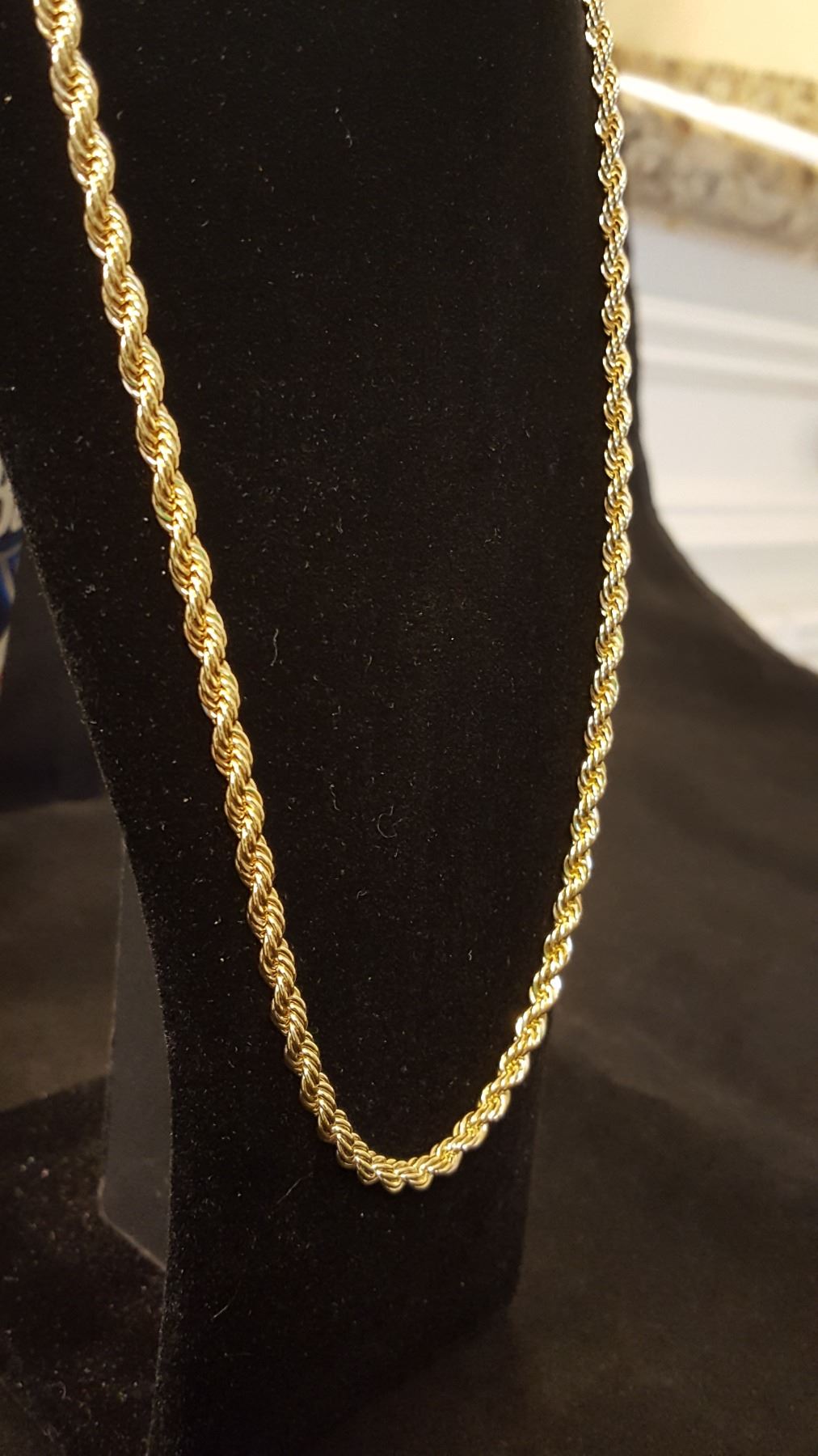 AWESOME 14 Kt. GOLD PLATED ROPE CHAIN.THIS CHAIN IS 24" LONG AND 3 mm. THICK. APPROX 23 GRAMS. SHOWS LIKE SOLID GOLD WITHOUT THE SOLID GOLD PRICE. GET READY FOR THE COMPLIMENTS ON THIS ONE.