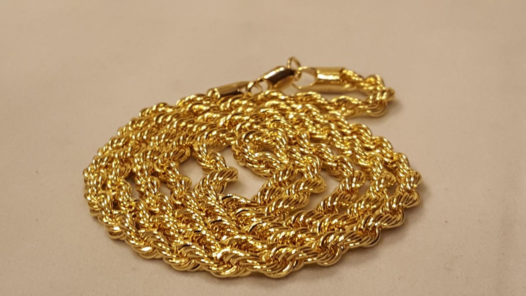 AWESOME 14 Kt. GOLD PLATED ROPE CHAIN.THIS CHAIN IS 24" LONG AND 3 mm. THICK. APPROX 23 GRAMS. SHOWS LIKE SOLID GOLD WITHOUT THE SOLID GOLD PRICE. GET READY FOR THE COMPLIMENTS ON THIS ONE.