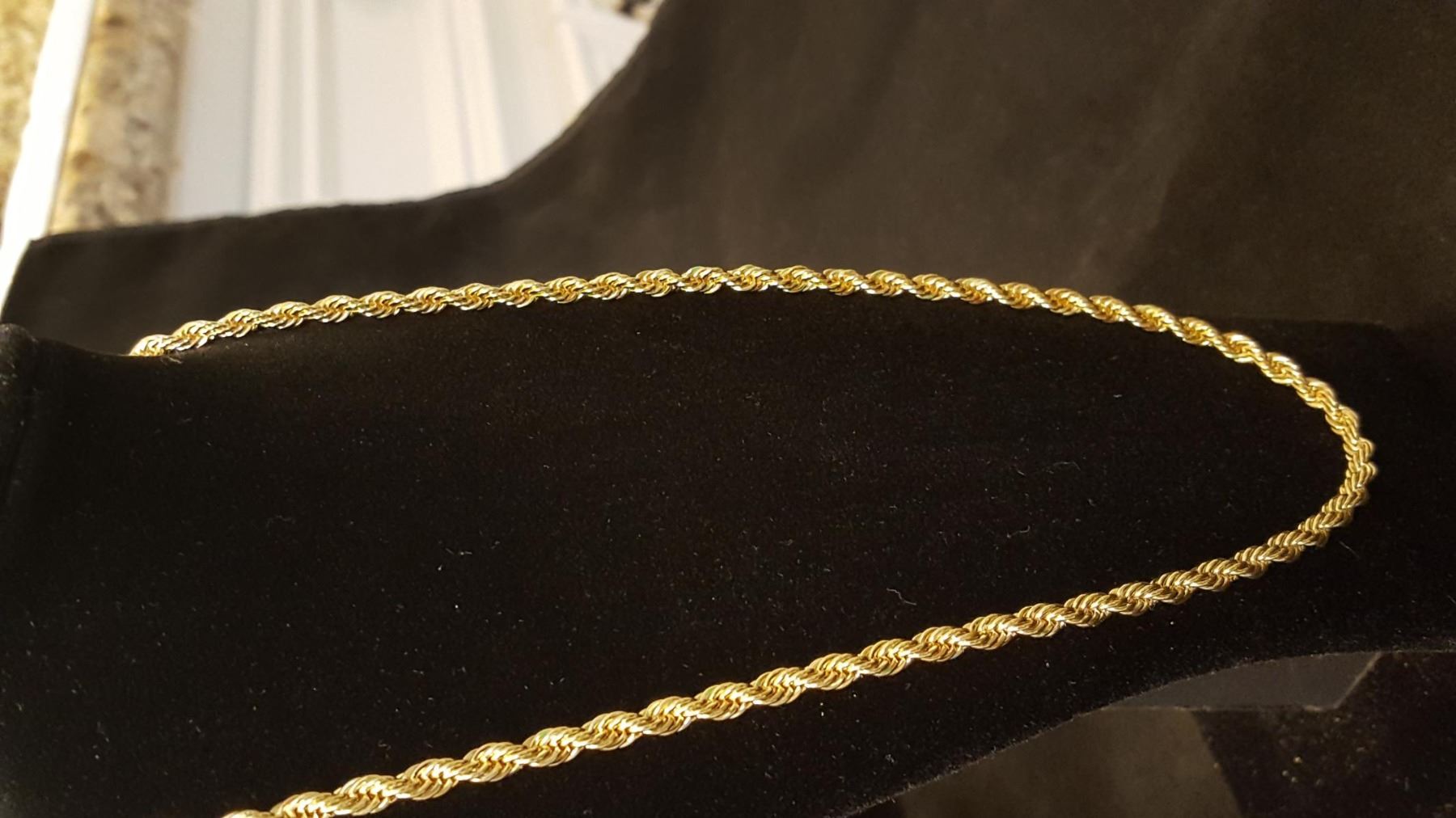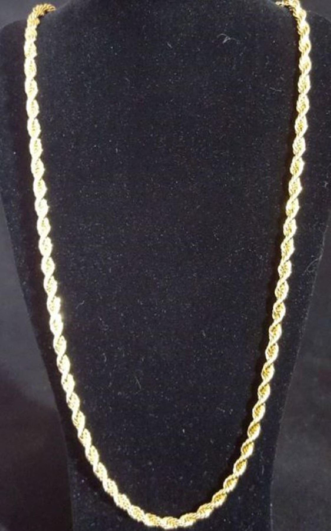 AWESOME 14 Kt. GOLD PLATED ROPE CHAIN.THIS CHAIN IS 24" LONG AND 3 mm. THICK. APPROX 23 GRAMS. SHOWS LIKE SOLID GOLD WITHOUT THE SOLID GOLD PRICE. GET READY FOR THE COMPLIMENTS ON THIS ONE.