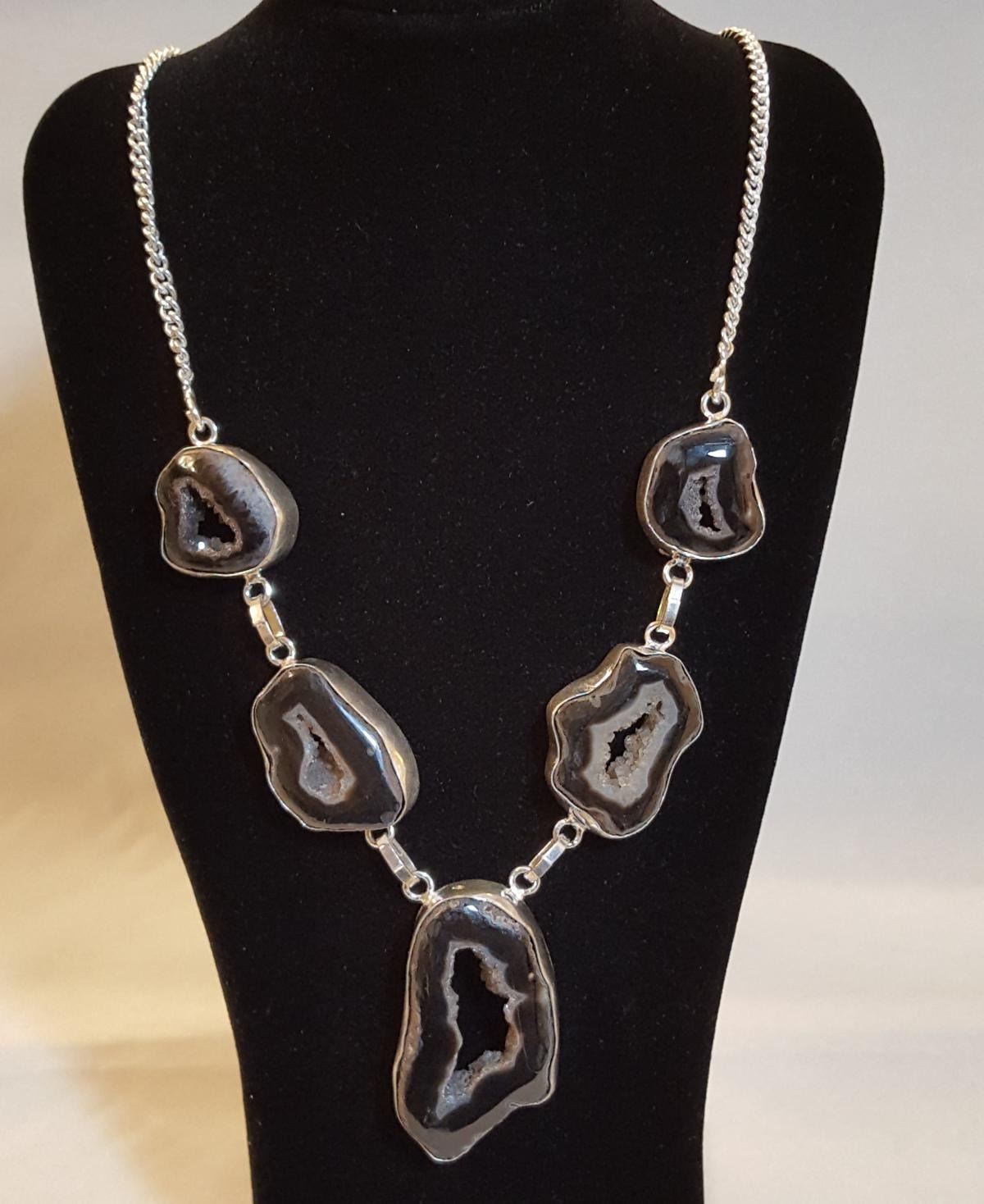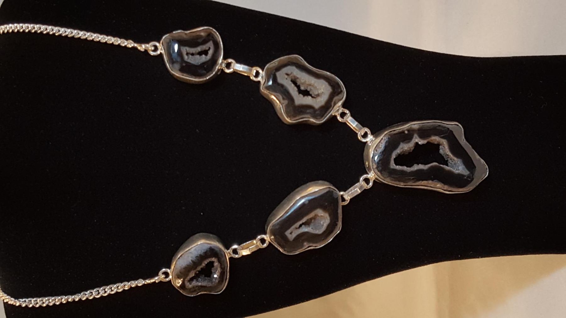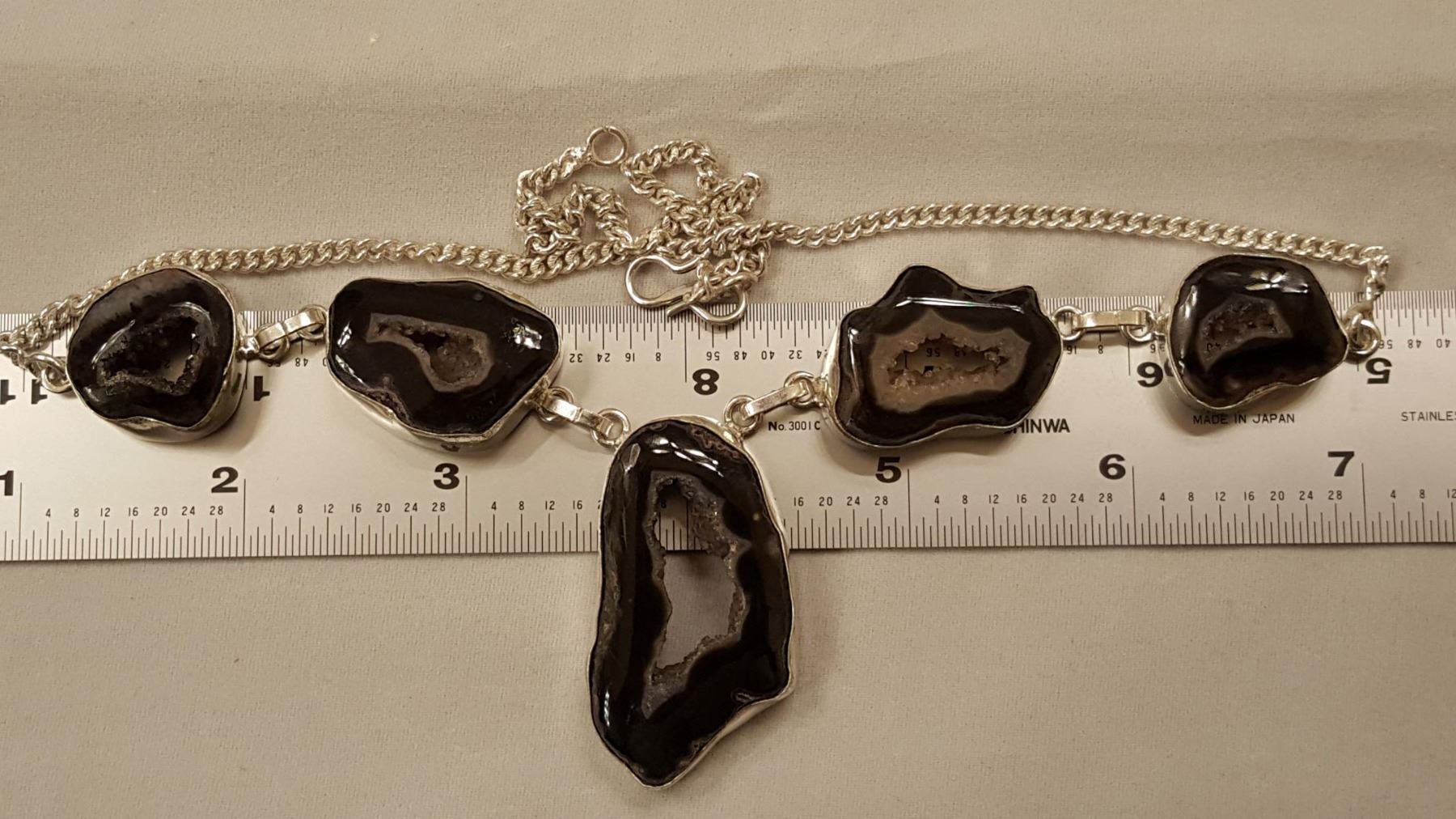 AWESOME 89.50 CT HIGHLY POLISHED BLACK AGATE DRUZY NECKLACE. MOUNTED IN .925 STERLING SILVER. 19" LONG .180 CTTW.