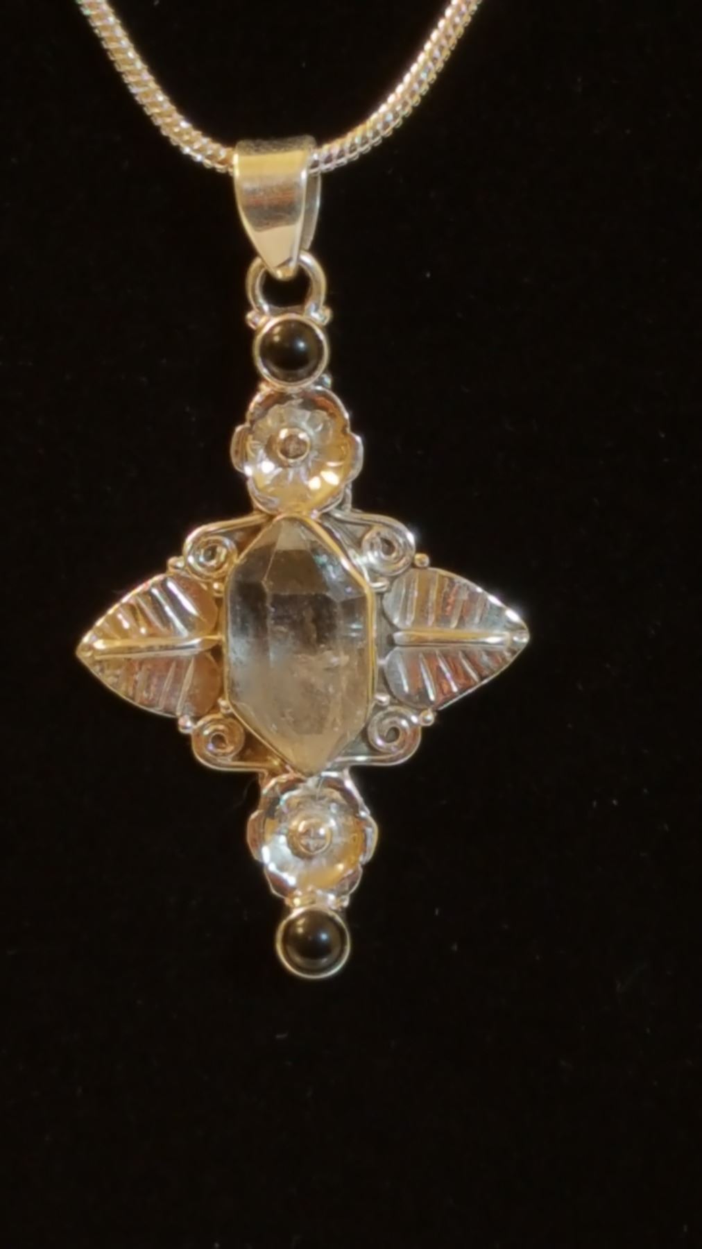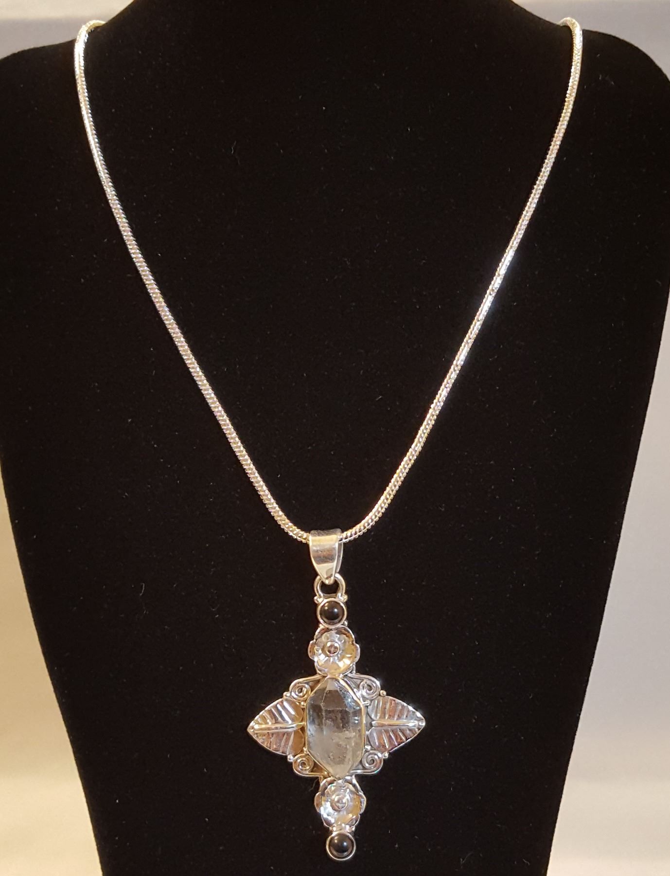 AWESOME NATURAL HERKIMER DIAMOND PENDANT. MOUNTED IN HEAVY SOLID .925 STERLING SILVER. COMPLIMENTED BY 2 BLACK ONYX ACCENT STONES. INCLUDES 20 " 2 mm. CHAIN. 73.5 CTTW OR 14.6 TOTAL GRAMS.These Highly Desired Gemstones Turn Heads. Herkimer Diamonds are Rare double terminated quartz crystals found only in a small are of Herkimer County, New York. This seems to be the Only Place that exact right conditions are to make these Beautiful Jewels. A double terminated crystal has points on both ends instead of just one end. These special crystals were first discovered in the early 1800's by settlers in New York and were named Herkimer diamonds due to their diamond-like shape. A typical Herkimer diamond has 18 facets: six upper, middle, and lower facets. They are also known for being Very Bright and Incredibly Clear