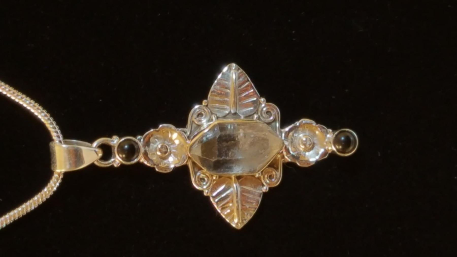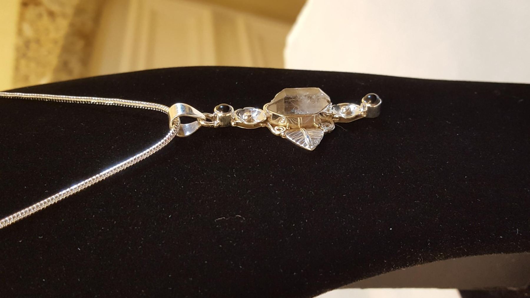 AWESOME NATURAL HERKIMER DIAMOND PENDANT. MOUNTED IN HEAVY SOLID .925 STERLING SILVER. COMPLIMENTED BY 2 BLACK ONYX ACCENT STONES. INCLUDES 20 " 2 mm. CHAIN. 73.5 CTTW OR 14.6 TOTAL GRAMS.These Highly Desired Gemstones Turn Heads. Herkimer Diamonds are Rare double terminated quartz crystals found only in a small are of Herkimer County, New York. This seems to be the Only Place that exact right conditions are to make these Beautiful Jewels. A double terminated crystal has points on both ends instead of just one end. These special crystals were first discovered in the early 1800's by settlers in New York and were named Herkimer diamonds due to their diamond-like shape. A typical Herkimer diamond has 18 facets: six upper, middle, and lower facets. They are also known for being Very Bright and Incredibly Clear