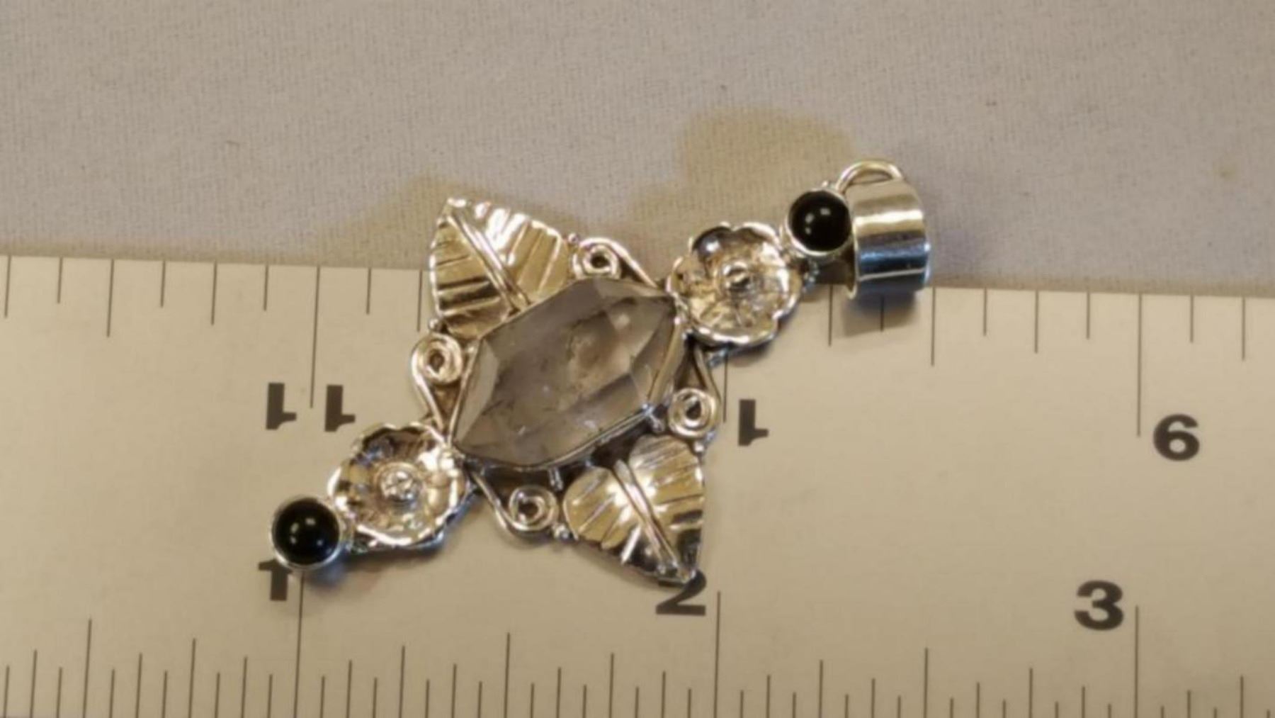 AWESOME NATURAL HERKIMER DIAMOND PENDANT. MOUNTED IN HEAVY SOLID .925 STERLING SILVER. COMPLIMENTED BY 2 BLACK ONYX ACCENT STONES. INCLUDES 20 " 2 mm. CHAIN. 73.5 CTTW OR 14.6 TOTAL GRAMS.These Highly Desired Gemstones Turn Heads. Herkimer Diamonds are Rare double terminated quartz crystals found only in a small are of Herkimer County, New York. This seems to be the Only Place that exact right conditions are to make these Beautiful Jewels. A double terminated crystal has points on both ends instead of just one end. These special crystals were first discovered in the early 1800's by settlers in New York and were named Herkimer diamonds due to their diamond-like shape. A typical Herkimer diamond has 18 facets: six upper, middle, and lower facets. They are also known for being Very Bright and Incredibly Clear
