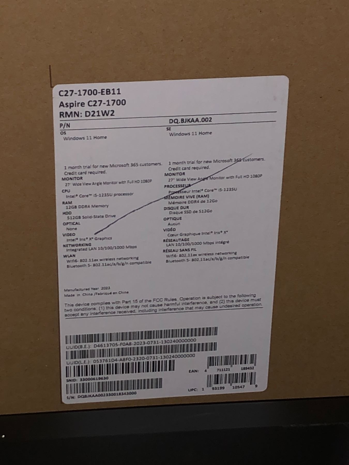 Retail - $1400 Intel Core i5-1235U decacore CPU with 12GB DDR4 3200MHz RAM provides accelerated performance for multitasking, productivity, and entertainment 512GB solid state drive provides fast and secure storage for music, movies, documents, photos, and more, Built-in 27" FHD monitor with 1920 x 1080 native resolution displays crisp-looking text and sharp images with vibrant colours, Integrated 10/100/1000 Ethernet and 2x2 Wi-Fi 6 AX201 (802.11ax) with dual bands 2.4GHz and 5GHz provide wired and wireless network connectivity with blistering fast speeds, MU-MIMO technology ensures maximum data speed of 2.4Gbps with low latency for uninterrupted streaming, downloading, and more, Integrated Bluetooth 5.2 for connecting compatible Bluetooth accessories and devices such as Bluetooth headsets or Bluetooth speakers, One 10Gbps USB 3.2 Gen 2 Type C port, 2 USB 3.2 Gen 1 Type-A ports, 1 USB 3.2 Type-A Gen 2 port, 1 USB 2.0 Type-A port, HDMI port, 1 LAN port, and, 1 audio jack provide comprehensive connectivity for devices and peripherals, 5MP HD webcam captures clear and bright images for connecting to friends, family, or colleagues over video calls, Preinstalled with a bilingual Windows 11 Home operating system that comes in an updated look with better performance and security