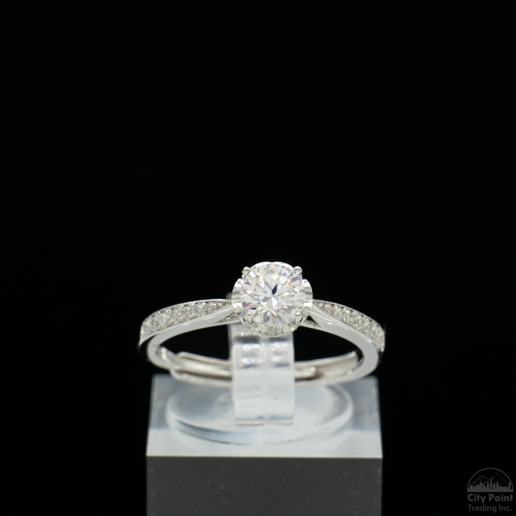 One stamped S925 sterling silver adjustable ring with a bright platinum-plated finish. The ring weighs 1.70 grams and is identified with markings of "S925." Containing: One prong-set round cut moissanite, approximately 0.50 carat. Condition is new. Comes with a box, pouch, and display box.
