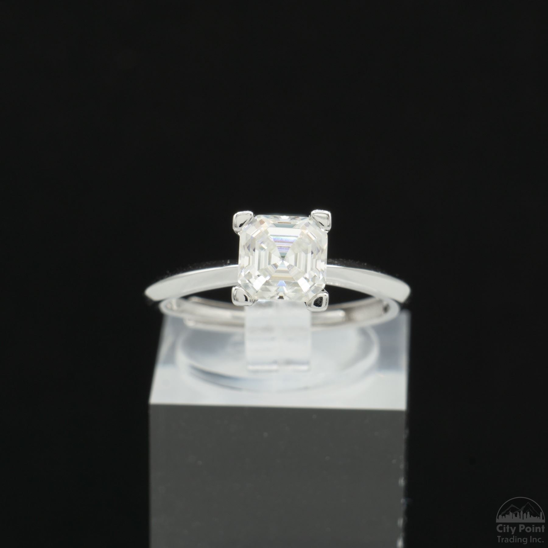 One stamped S925 sterling silver adjustable ring with a bright platinum-plated finish. The ring weighs 1.85 grams and is identified with markings of "S925." Containing: One prong-set Asscher cut moissanite, approximately 1.20 carats. Condition is new. Comes with a box, pouch, and display box.