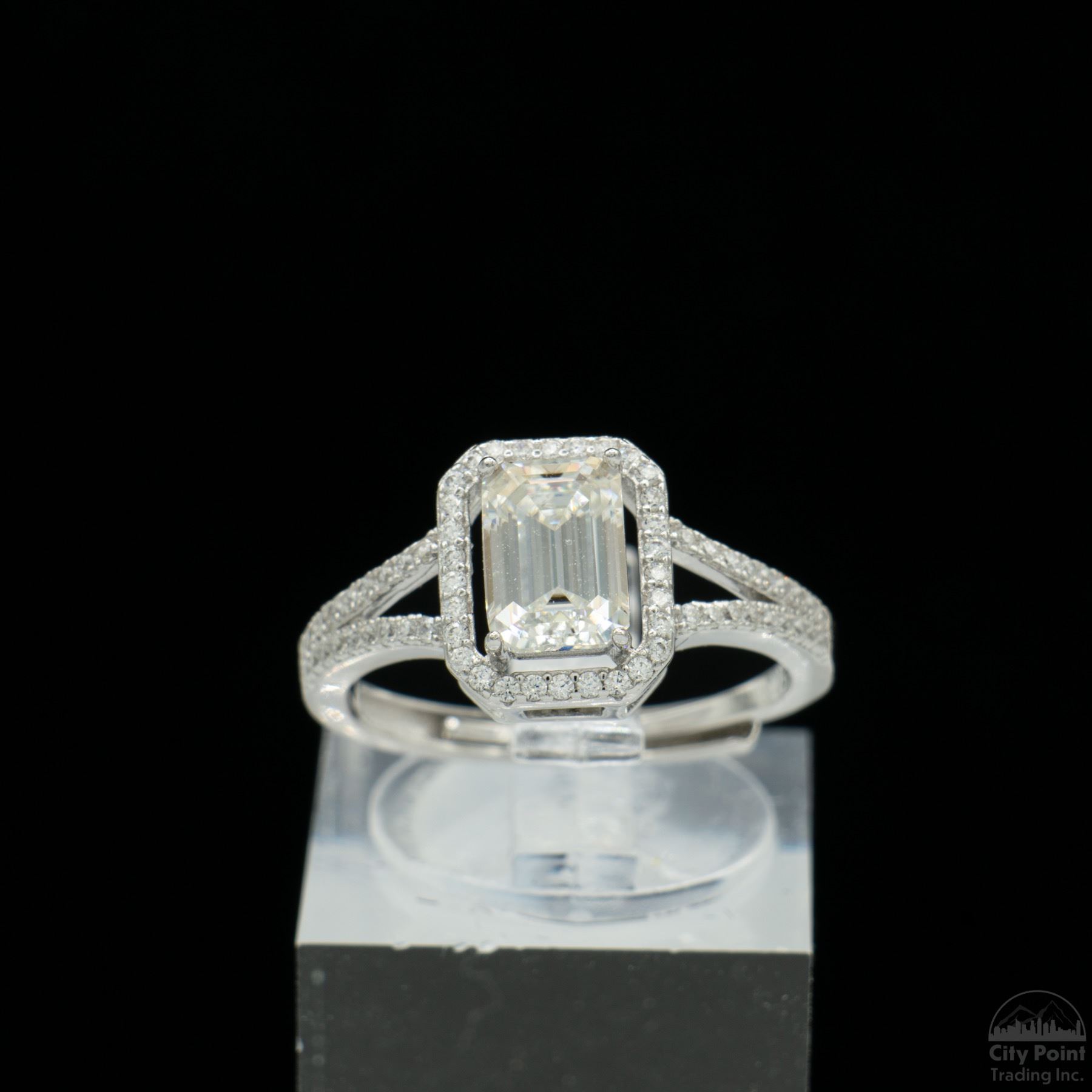One stamped S925 sterling silver adjustable ring with a bright platinum-plated finish. The ring weighs 2.23 grams and is identified with markings of "S925." Containing: One prong-set emerald cut moissanite, approximately 1.20 carats. Condition is new. Comes with a box, pouch, and display box.