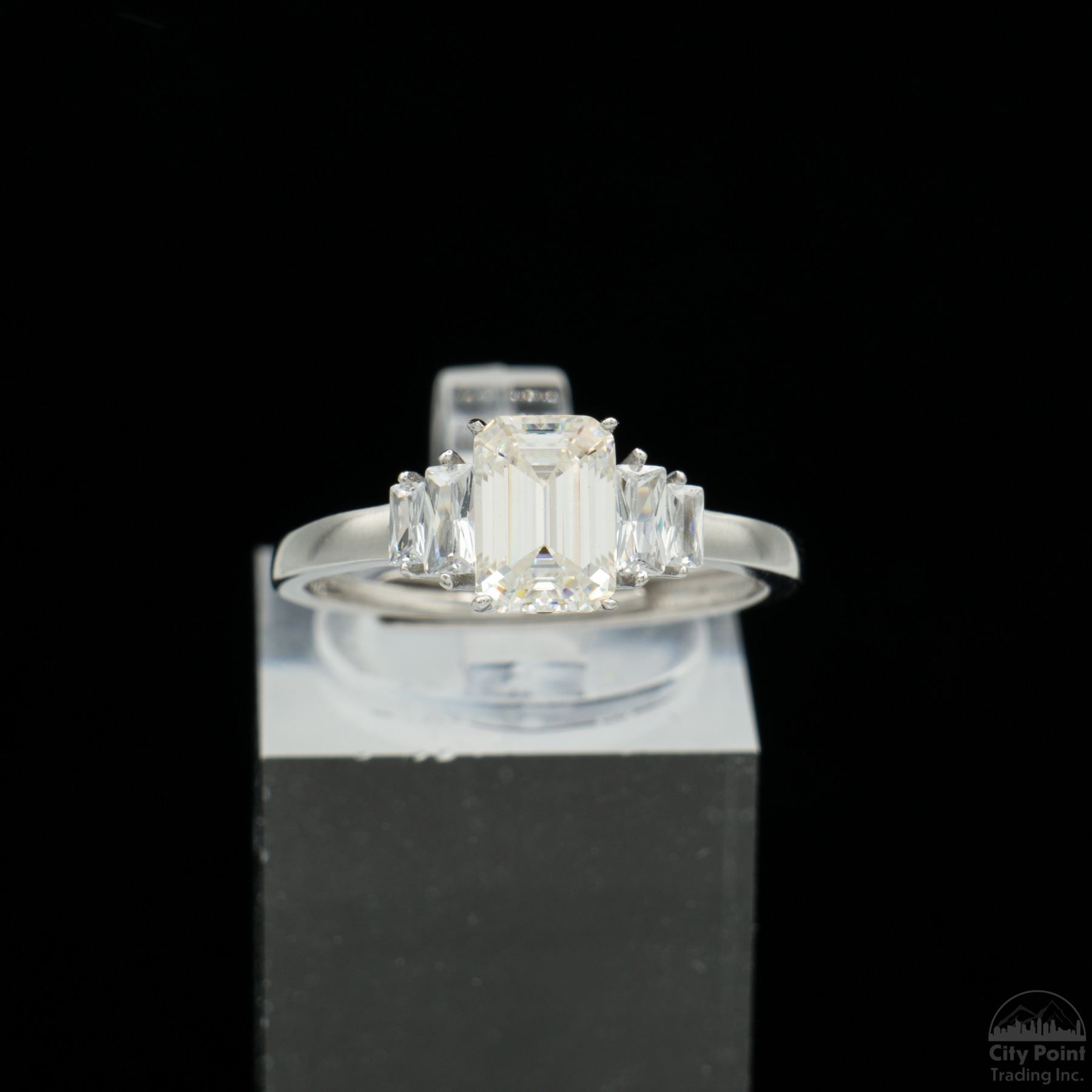 One stamped S925 sterling silver adjustable ring with a bright platinum-plated finish. The ring weighs 1.93 grams and is identified with markings of "S925." Containing: One prong-set emerald cut moissanite, approximately 1.20 carats, accompanied by four prong-set moissanite side baguettes. Condition is new. Comes with a box, pouch, and display box.