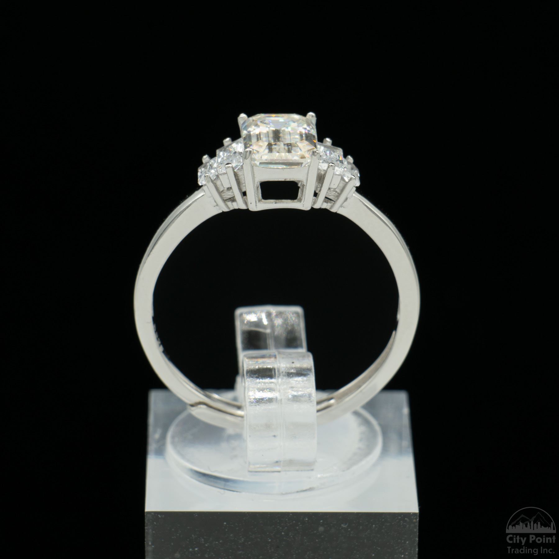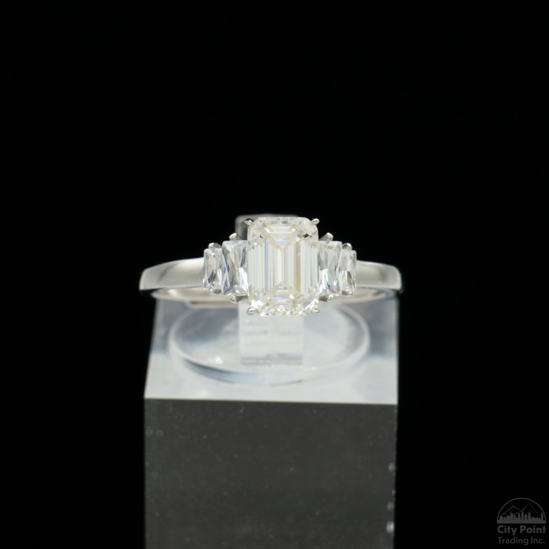 One stamped S925 sterling silver adjustable ring with a bright platinum-plated finish. The ring weighs 1.93 grams and is identified with markings of "S925." Containing: One prong-set emerald cut moissanite, approximately 1.20 carats, accompanied by four prong-set moissanite side baguettes. Condition is new. Comes with a box, pouch, and display box.