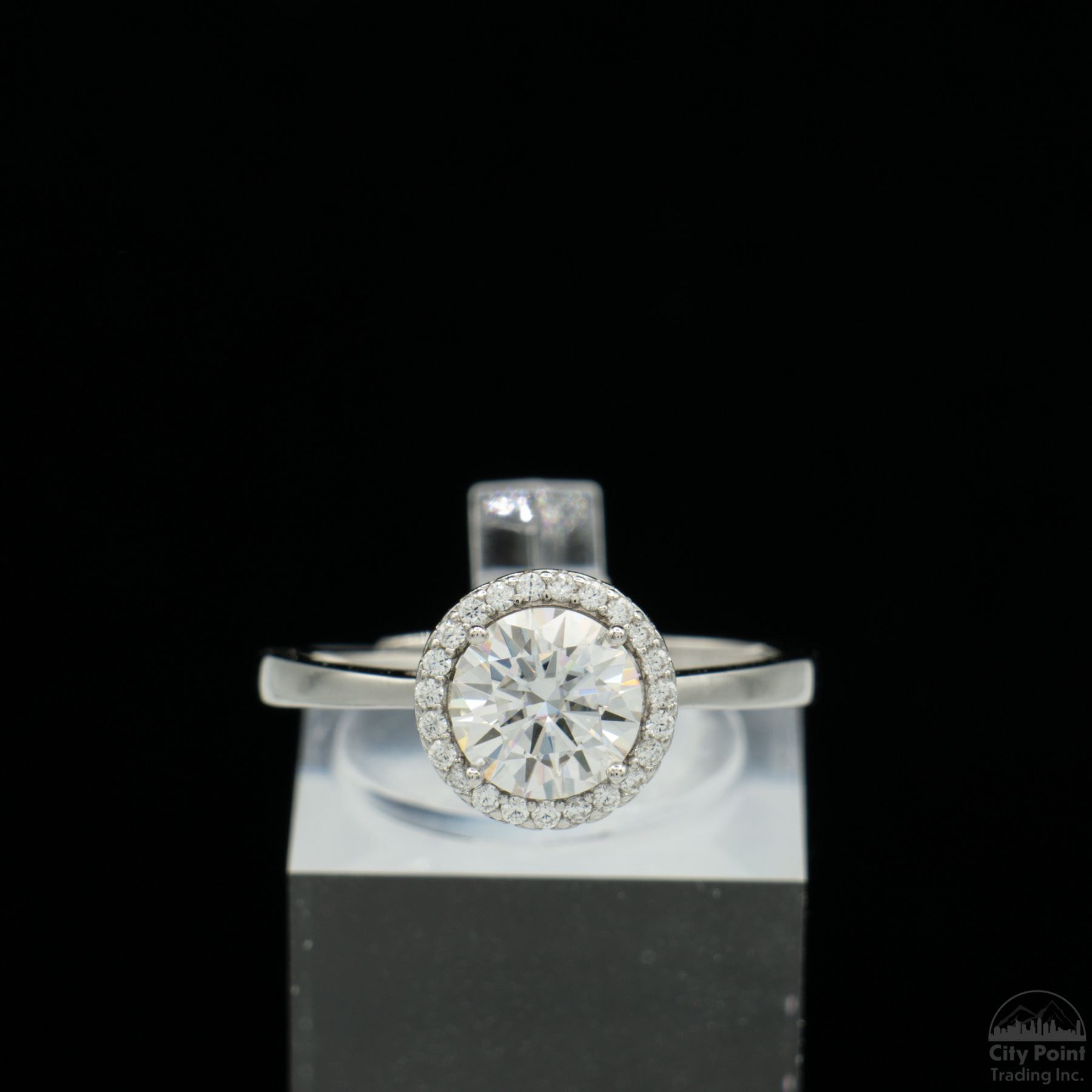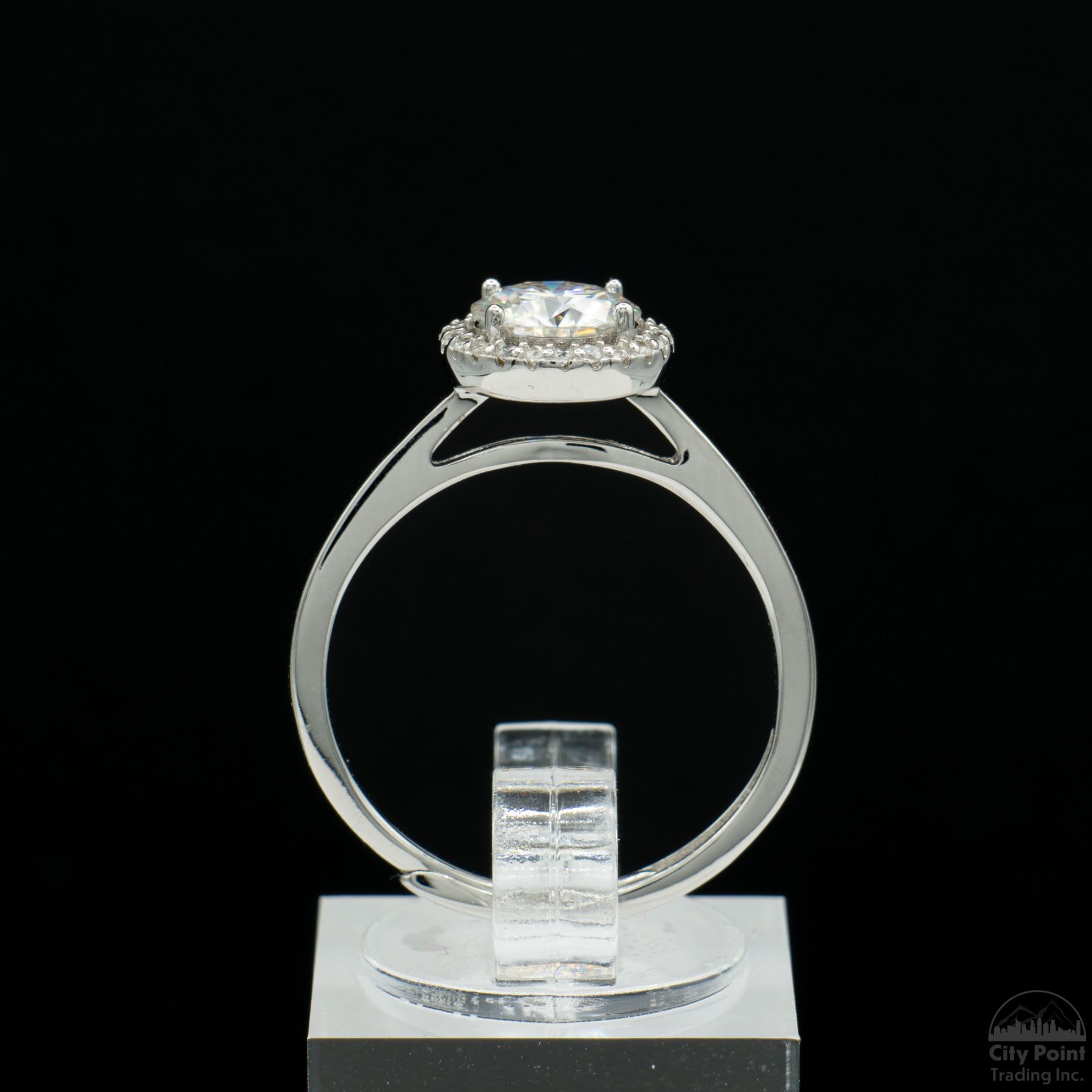 One stamped S925 sterling silver adjustable ring with a bright platinum-plated finish. The ring weighs 2.19 grams and is identified with markings of "S925." Containing: One prong-set round cut moissanite, approximately 1.00 carat. Condition is new. Comes with a box, pouch, and display box.