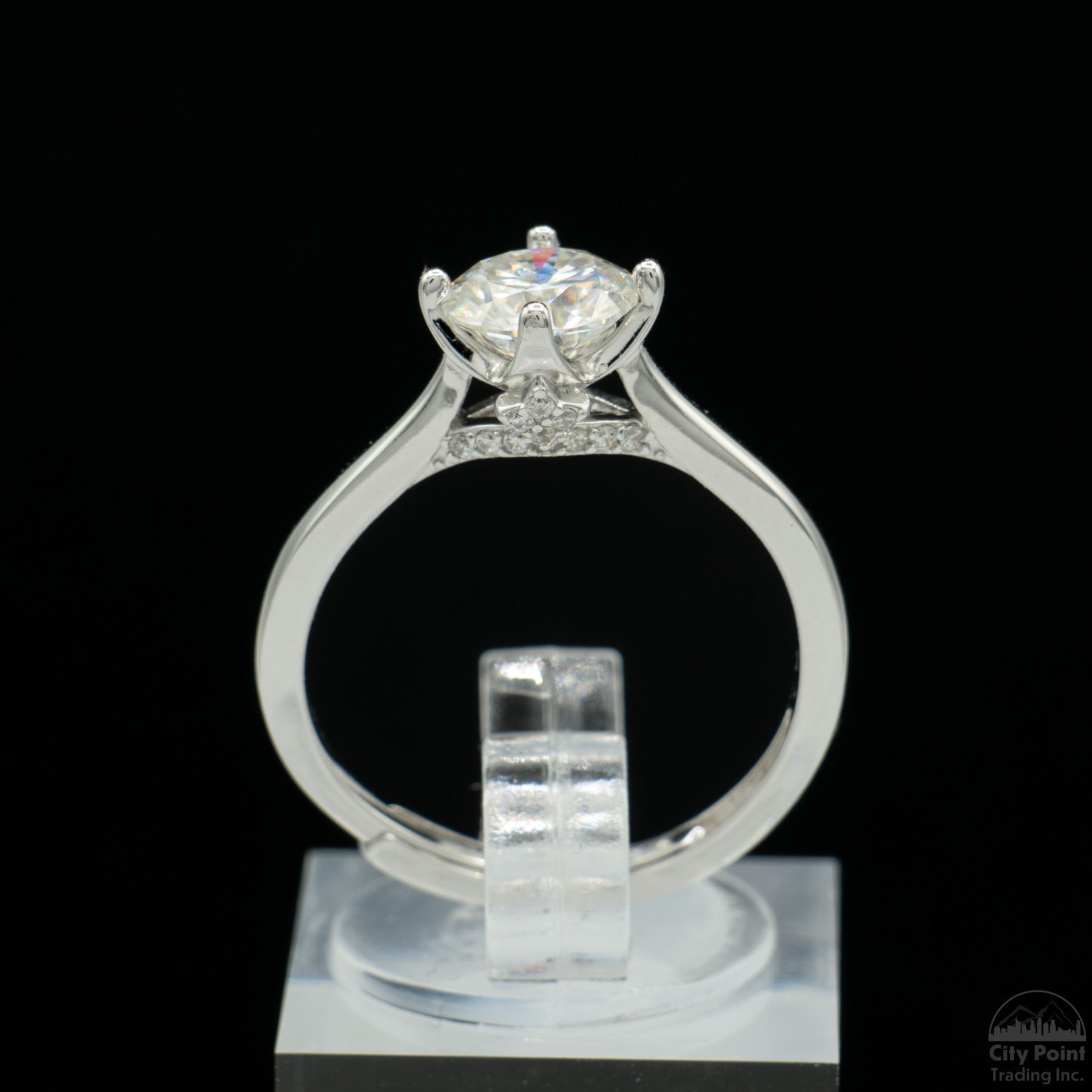 One stamped S925 sterling silver adjustable ring with a bright platinum-plated finish. The ring weighs 2.18 grams and is identified with markings of "S925." Containing: One prong-set round cut moissanite, approximately 1.00 carat. Condition is new. Comes with a box, pouch, and display box.