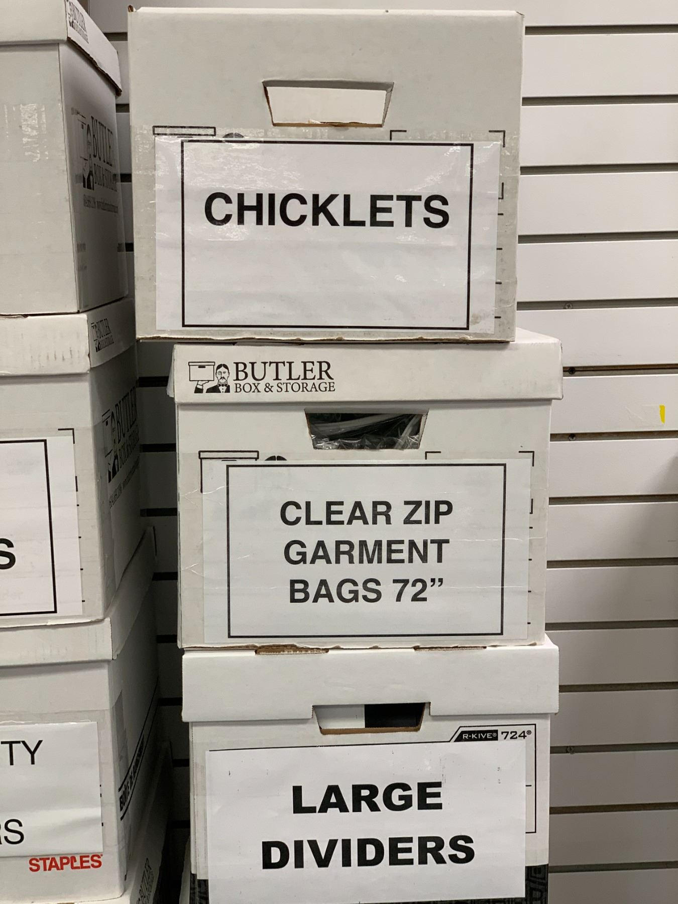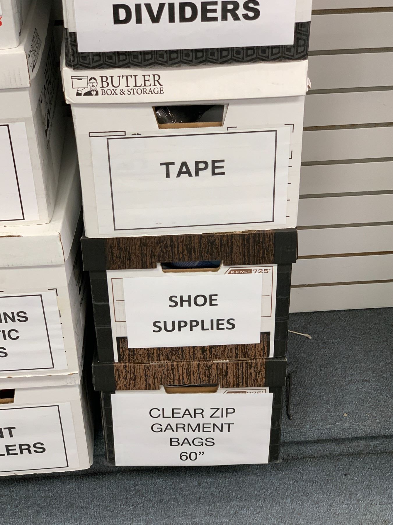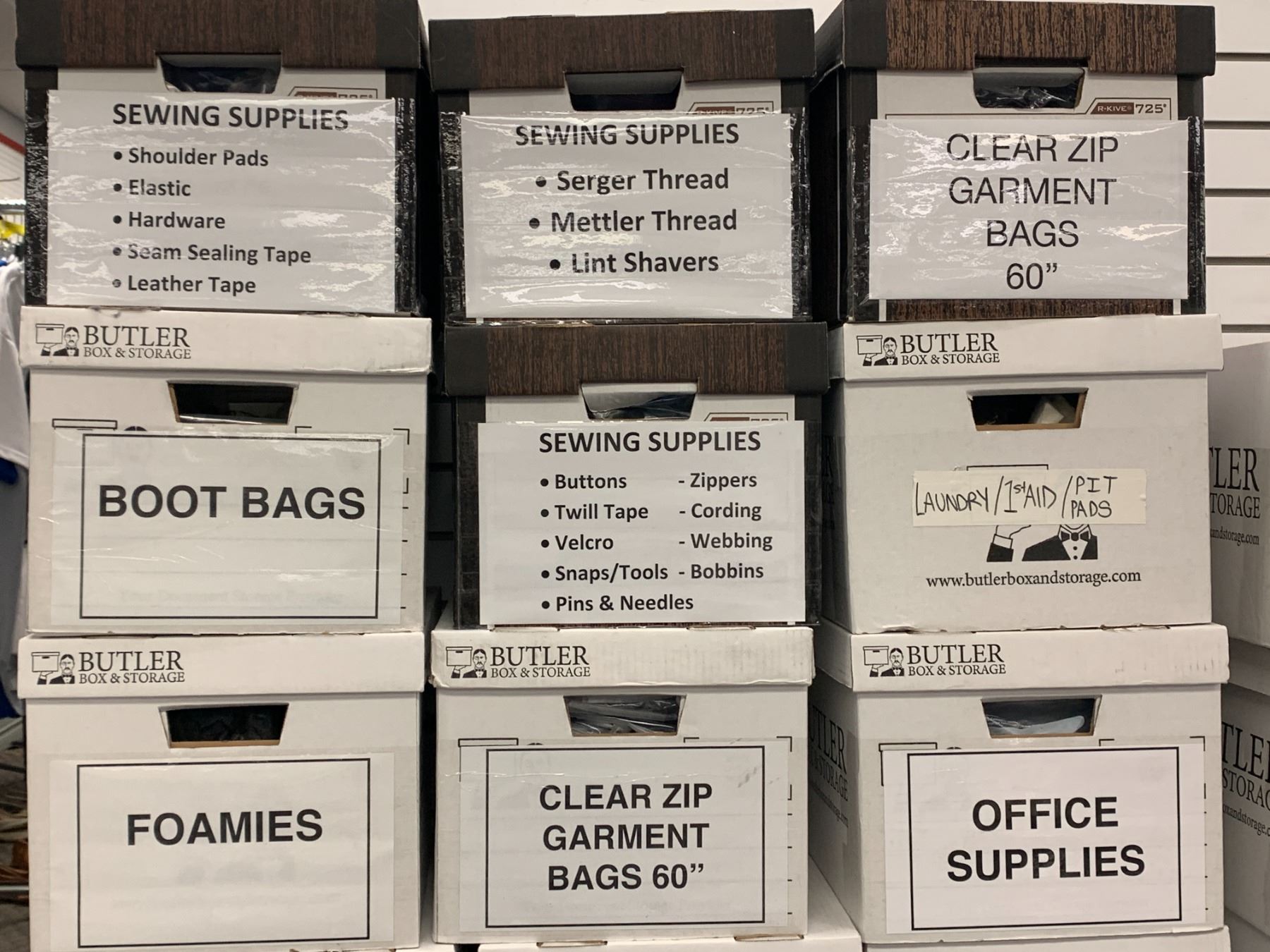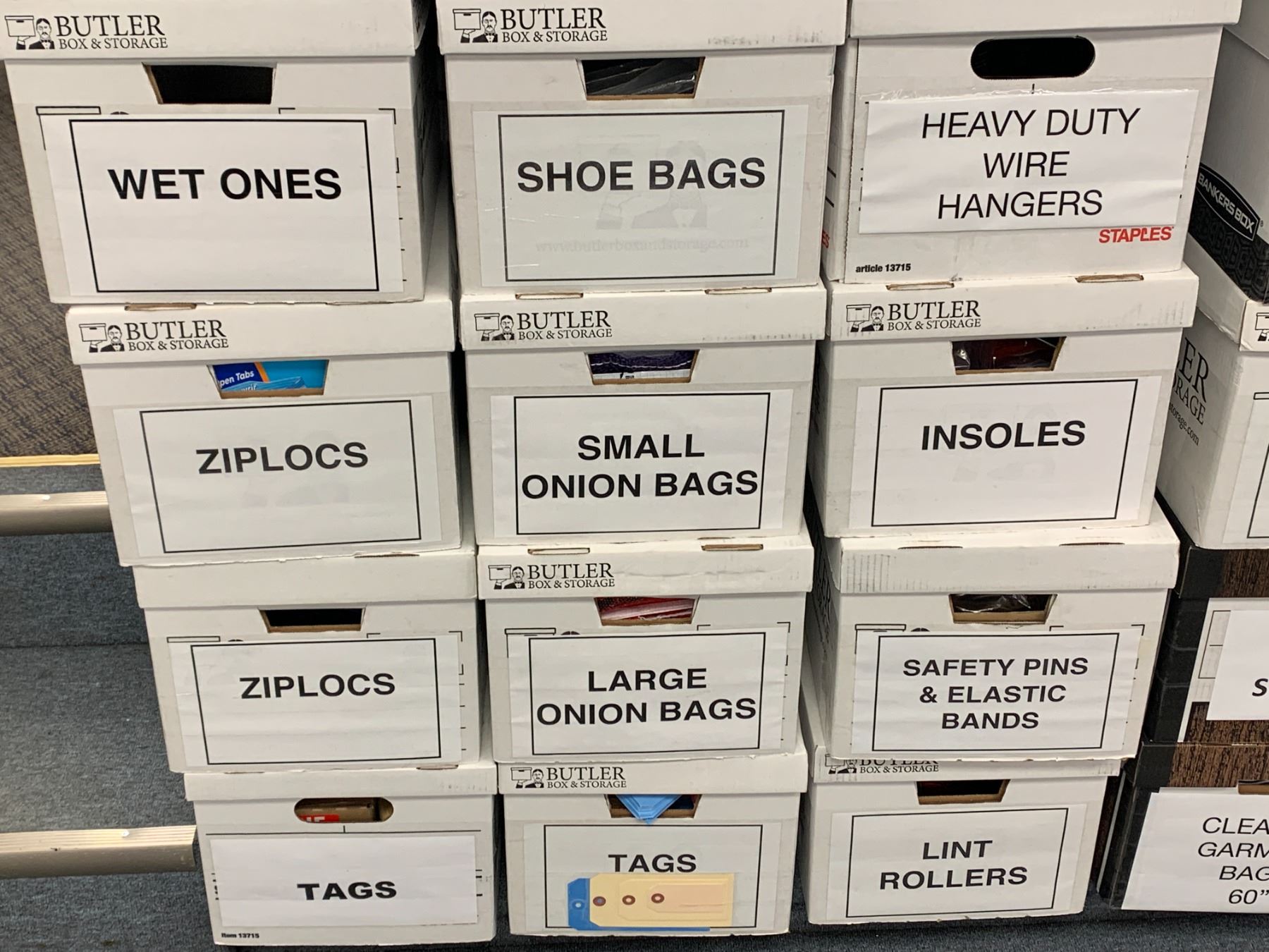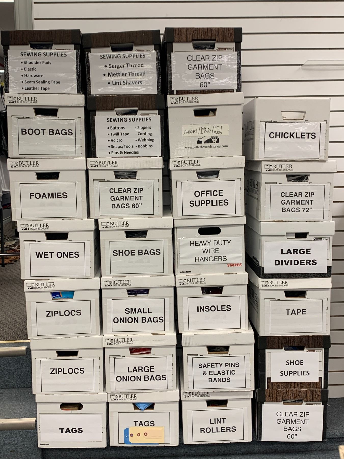 "Adventure Mystery Movie" - 27 boxes filled w/ wardrobe accessories includes garment bags/ wire hangers/ insoles/ zip locks/ sewing supplies/ tags & much more