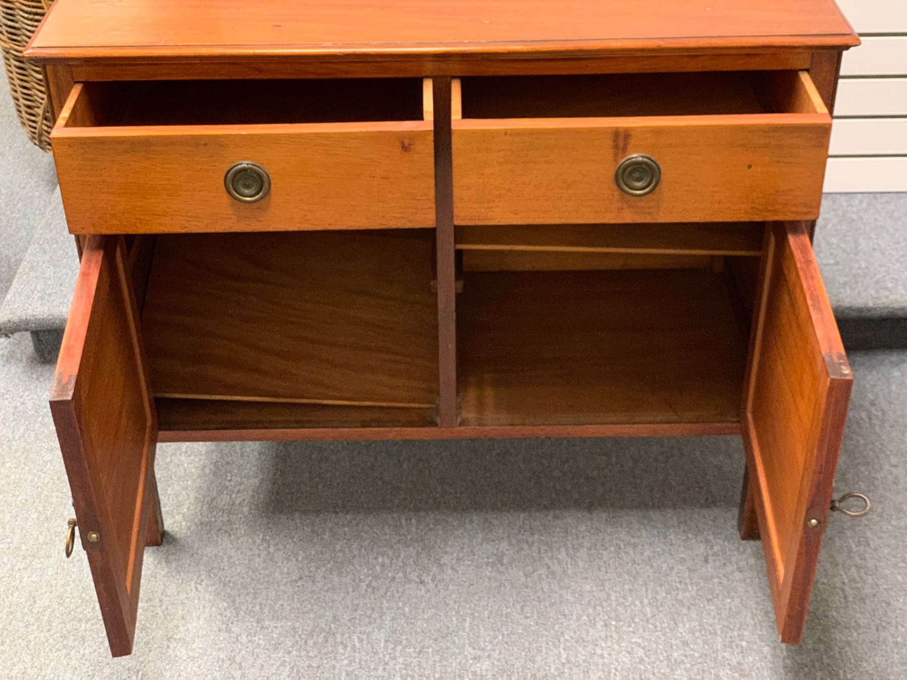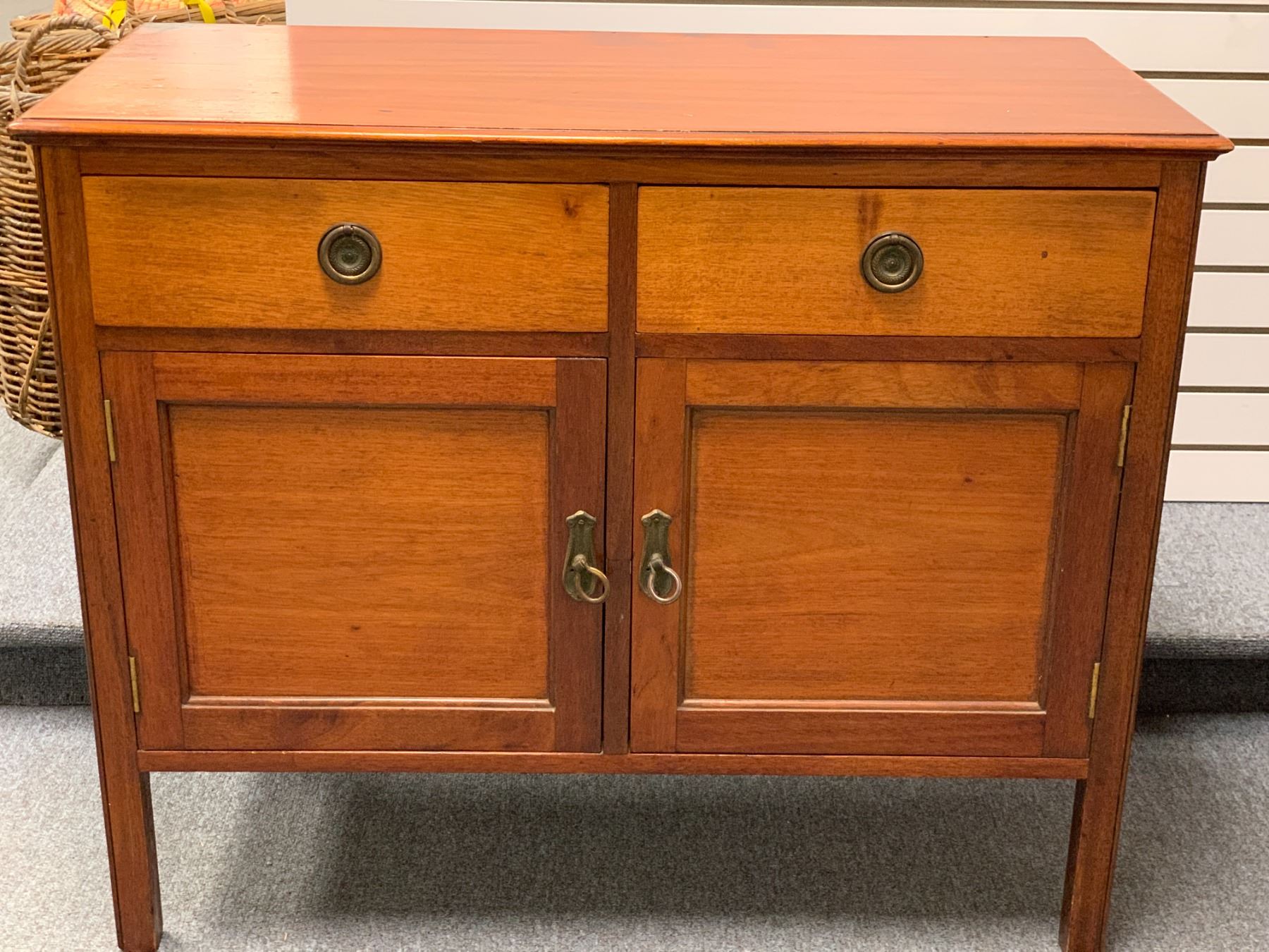 "Adventure Mystery Movie" - Antique 2-drawer wooden buffet cabinet (approx. 36in wide x 17 1/2in depth x 29 1/2in height)