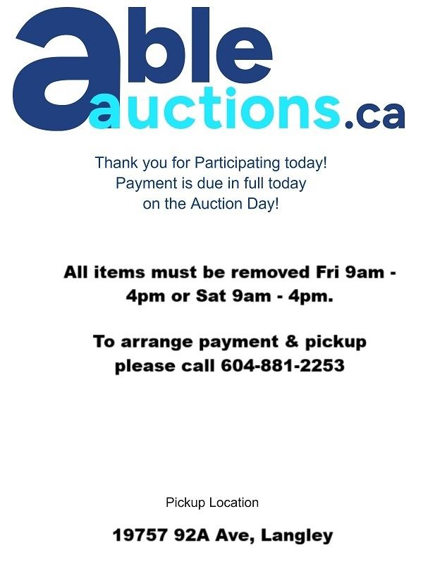 Payment is due in full by 12noon Jan 31st. You can authorize us by calling 604-881-2253 we can directly charge your Visa or MC on file for invoices under $999. *Please note we will need to have a verbal confirmation of the last 4 digits of your credit card to process the payment* For invoices over $999 please send e-transfers to payment@ableauctions.ca . We ask you call to book a time slot for pick up.