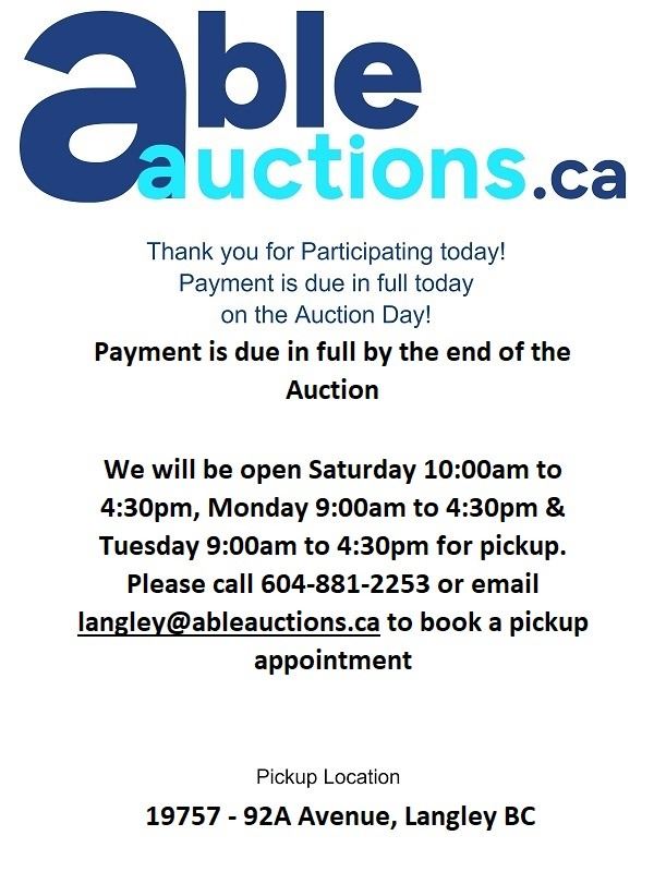 Payment is due in full today. You can authorize us by calling 604-881-2253 we can directly charge your Visa or MC on file for invoices under $999. *Please note we will need to have a verbal confirmation of the last 4 digits of your credit card to process the payment* For invoices over $999 please send e-transfers to payment@ableauctions.ca . We ask you call to book a time slot for pick up.