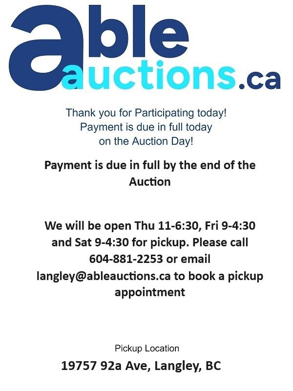 Payment is due in full today. You can authorize us by calling 604-881-2253 we can directly charge your Visa or MC on file for invoices under $999. *Please note we will need to have a verbal confirmation of the last 4 digits of your credit card to process the payment* For invoices over $999 please send e-transfers to payment@ableauctions.ca . We ask you call to book a time slot for pick up.