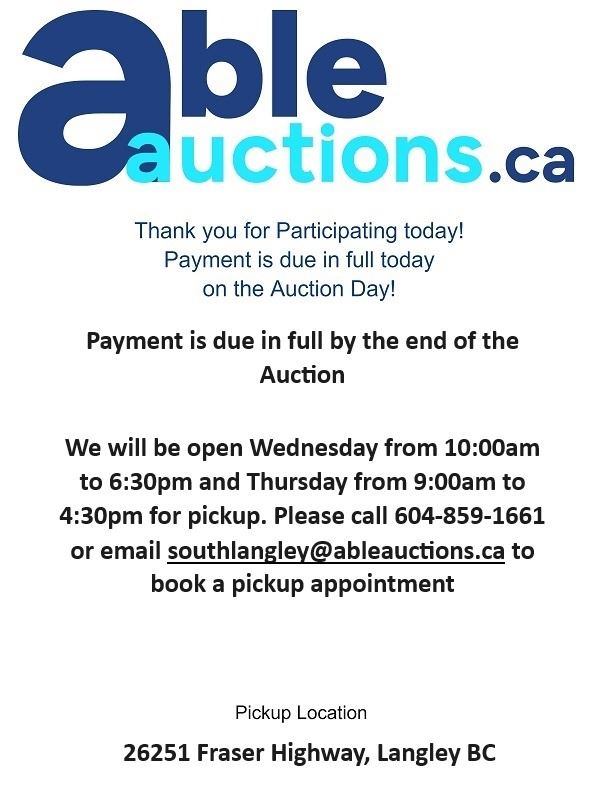 Payment is due in full today. if you authorize us by calling 604-859-1661 we can directly charge your Visa or MC on file (only applies to purchases under $999). *Please note we will need to have a verbal confirmation of the last 4 digits of your credit card to process the payment* For e-transfers please email them to payment@ableauctions.ca Payment is Online only. Pickup is by appointment please call to book a time slot.