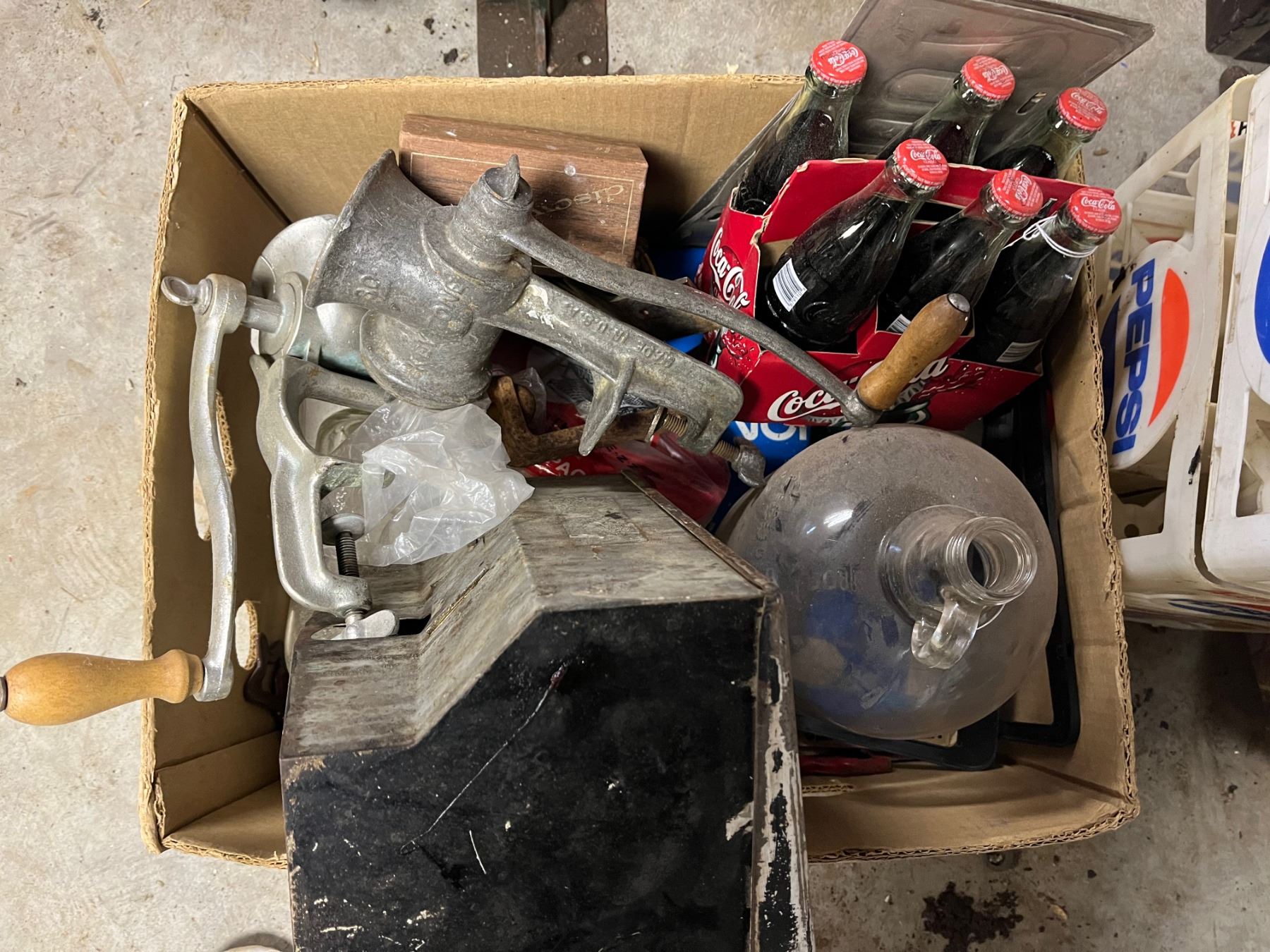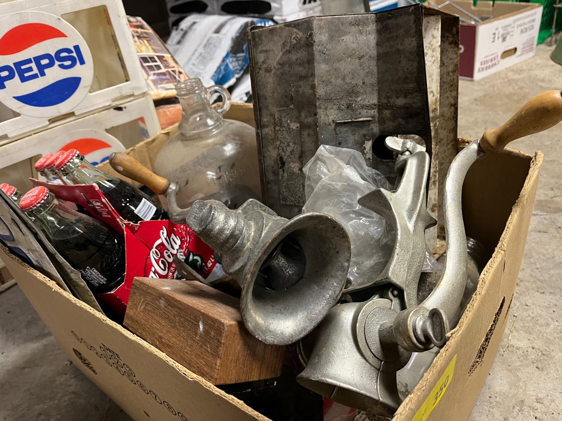 Aluminum meat mincer, gas station towel box & misc license plate w/ Pepsi crates & work horse
