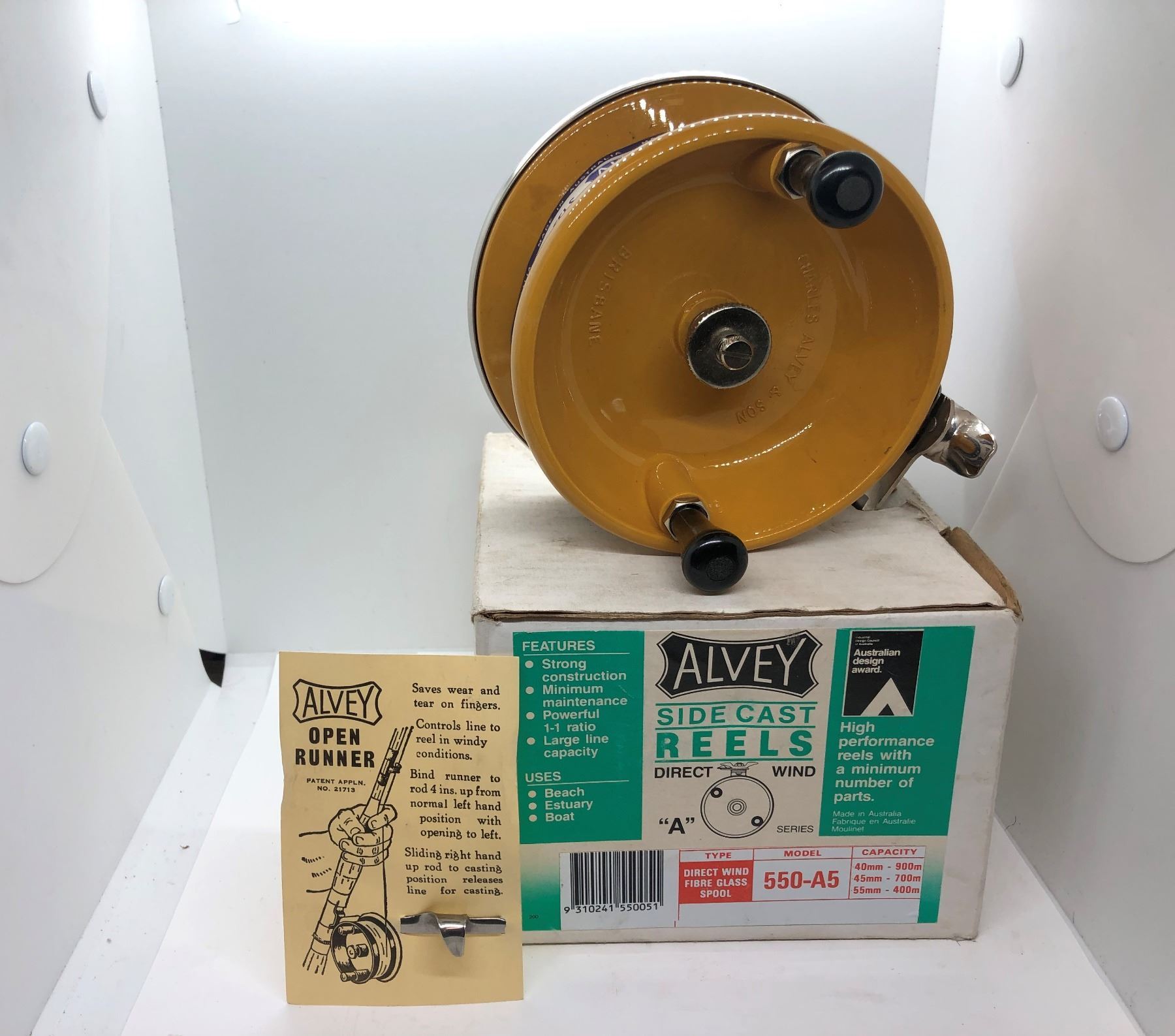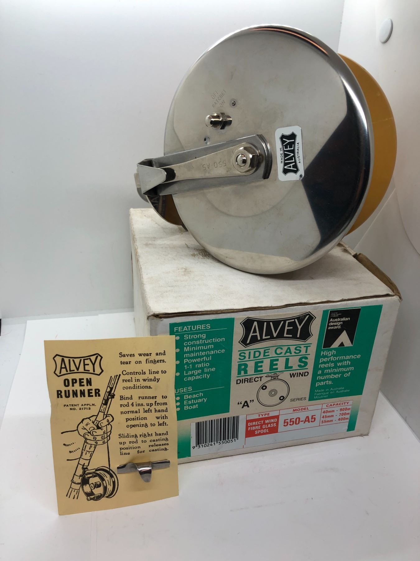 Alvey model 550-A5 Side Cast/ Open Runner fishing reel Made in Australia (NOS) w/ original box