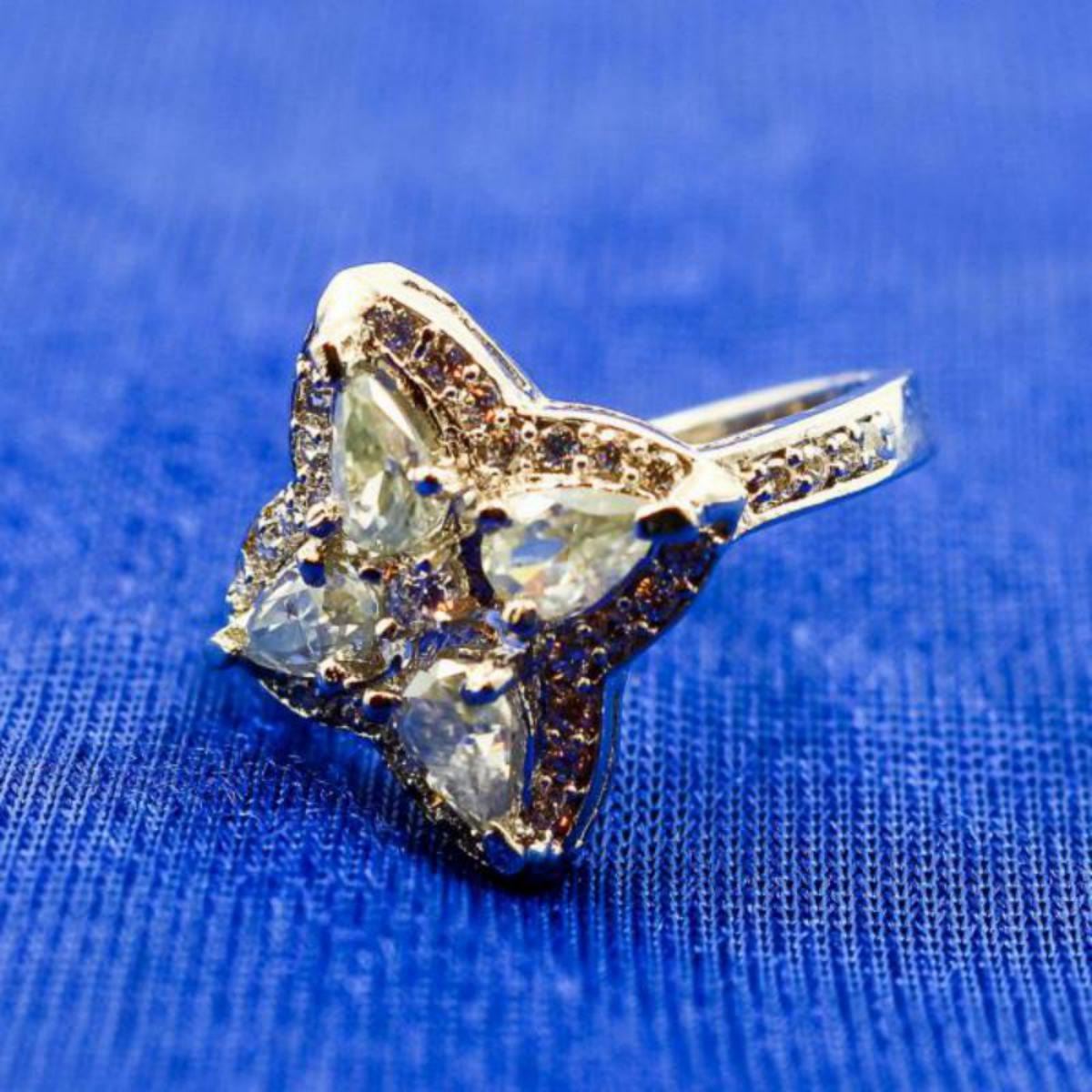 Amazing 3.52 Ct Ice Green Diamond Ring. This Lab Created Diamond Ring Features Four Pear Cuts With CZ Accent Stones. Mounted in solid .925 sterling silver and is a size 7 1/2. Moissanite is the world's most brilliant gem. With a refractive index of 2.65-2.69 , Moissanite has more brilliance then a diamond.Thanks to a dispertion that is 2.4 times higher than a diamond, moissanite bends light into mesmerizing rainbow electric flashes of fire. More than twice as much as a diamond. By day and by night moissanites lengendary brilliance is spectacular. Total gram wt. is appox 4.7