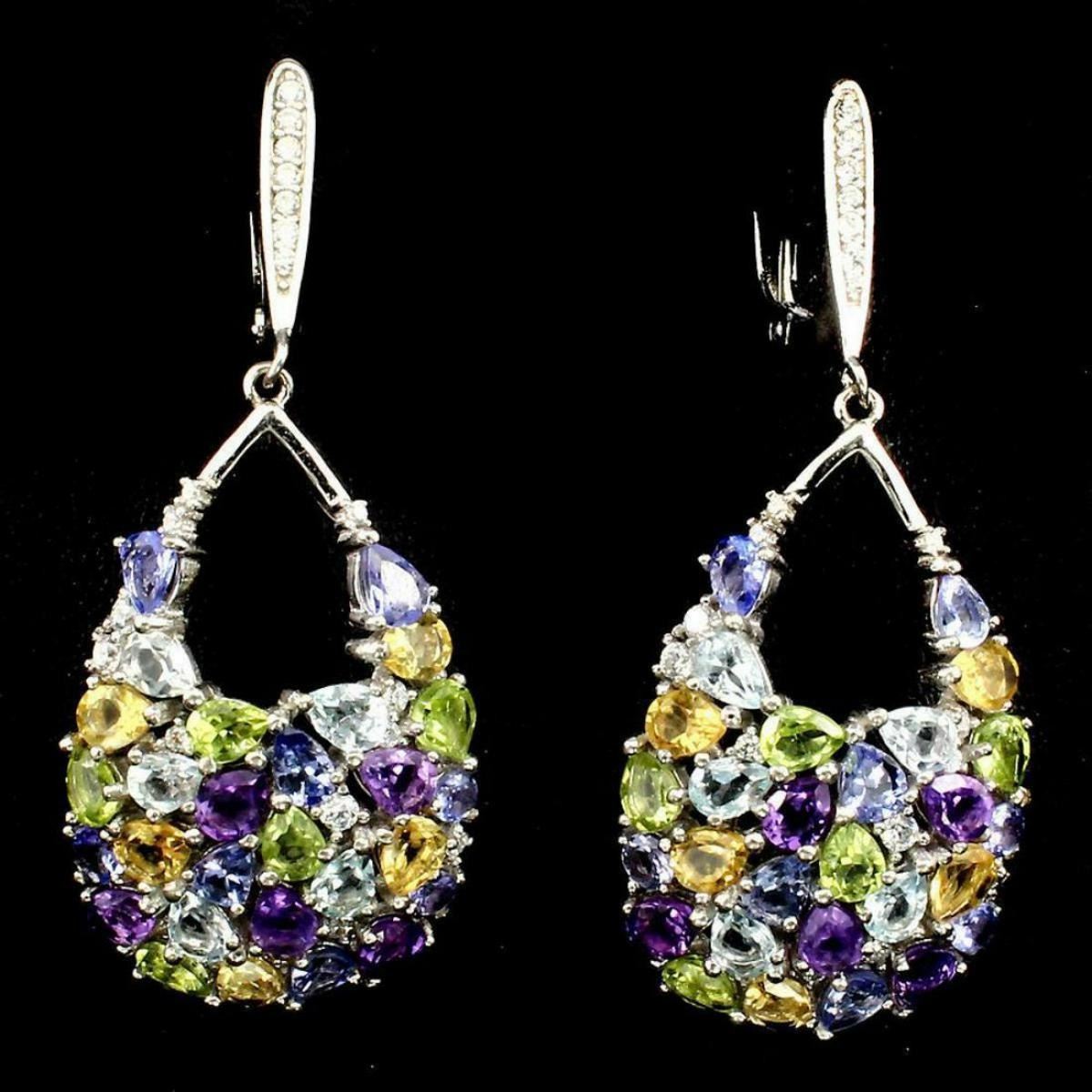 925 STERLING SILVER........ PLATE ...14K WHITE GOLD... MAIN STONE AMETHYST OTHER GEMS CITRINE,CUBIC ZIRCONIA,PERIDOT,SKY BLUE TOPAZ,TANZANITE TOTAL WEIGHT 53.77 CT (TOTAL WEIGHT OF SILVER + STONE) DIMENSION * STONE 4.0 X 3.0 MM. * CZ 1.0 TO 2.0 MM. * FACE EARRINGS 46.0 X 19.0 MM. MAIN STONE SHAPE PEAR CUT MAIN STONE COLOR TOP RICH PURPLE CLARITY/GRADE IF TO VVS LUSTER DELUXE TREATMENT UNHEATED ORIGIN BRAZIL