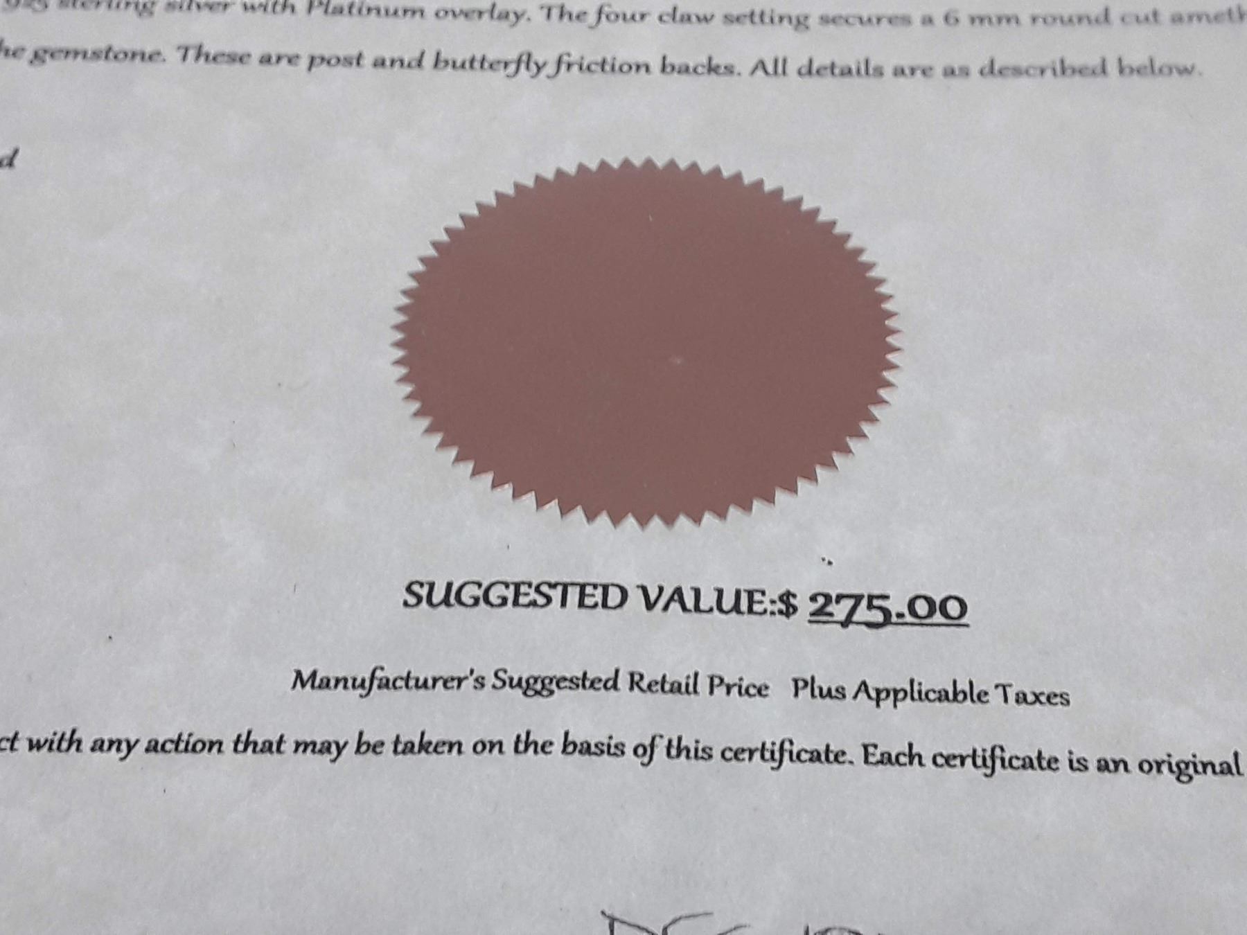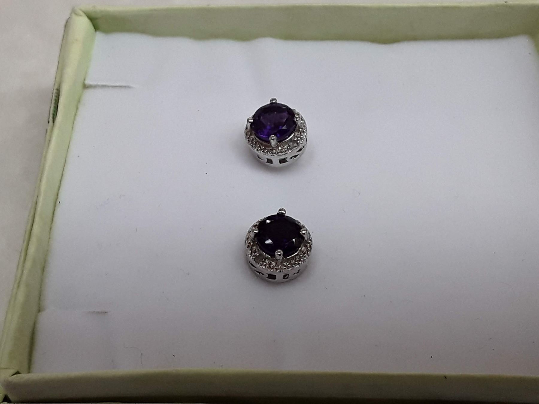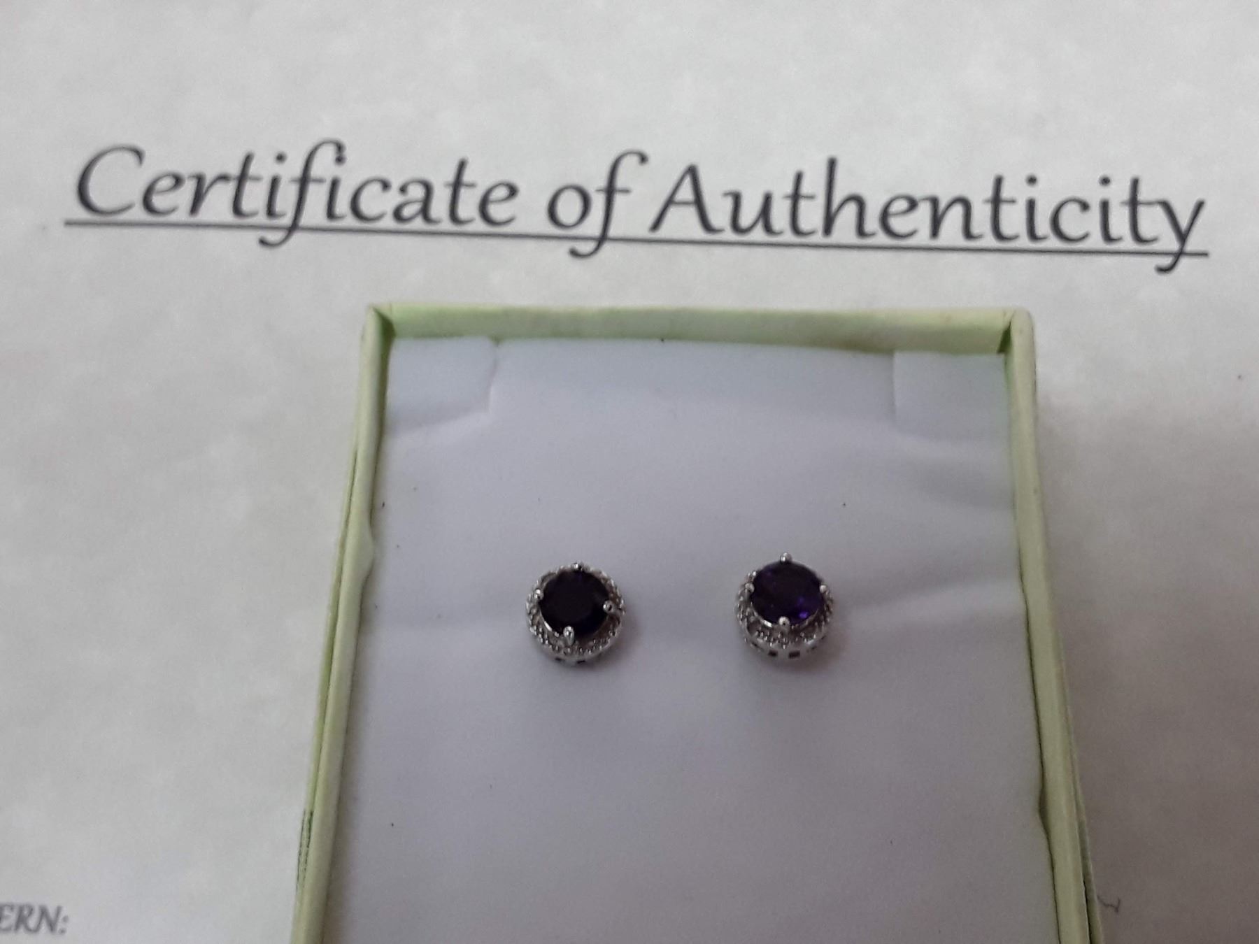 Amethyst + Diamond Earrings In 925 Silver With Platinum Overlay, 6mm Round Cut Amethyst, Suggested Value $275 With Certificate -- 17% Buyer Fee. Payment Processed through Live Auction World Saturday @ 11:15 ( Visa or Master Card ) pick up Saturday Before 3:00, or Tuesday 9:30 till 5:02