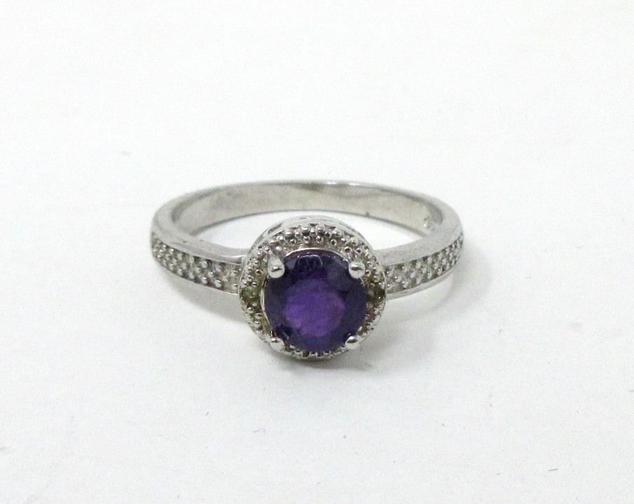 Round cut, rich, deep purple amethyst & 2 diamonds set in sterling silver.