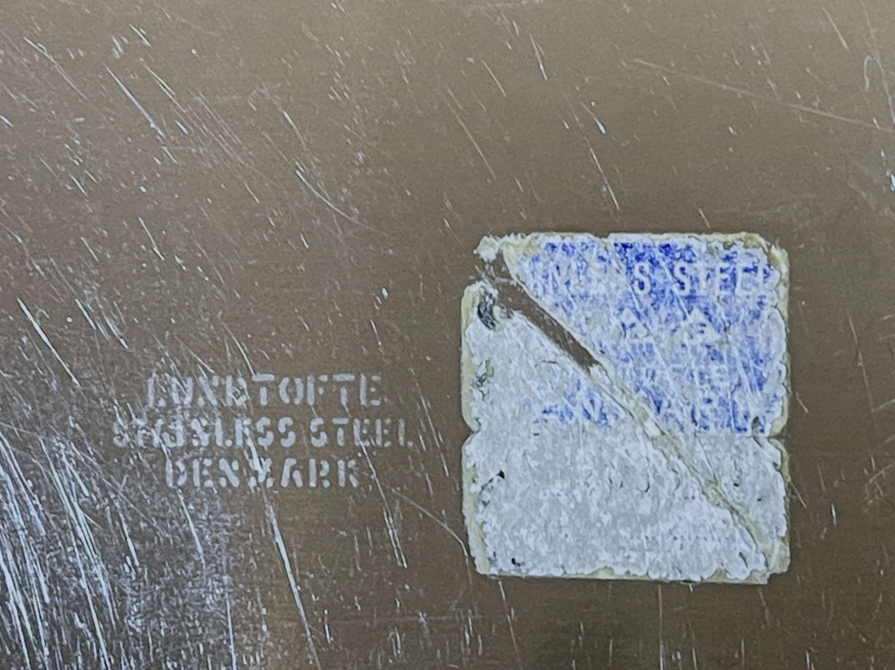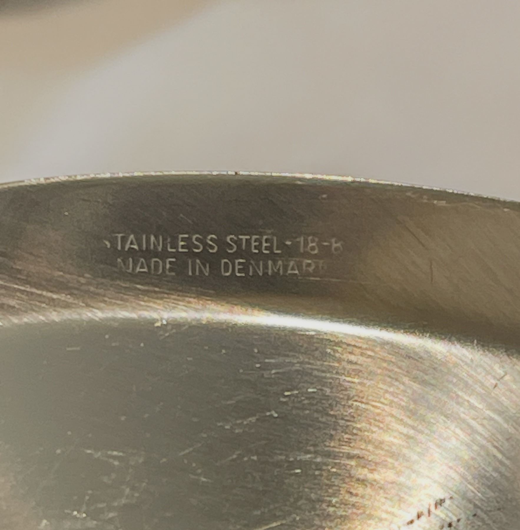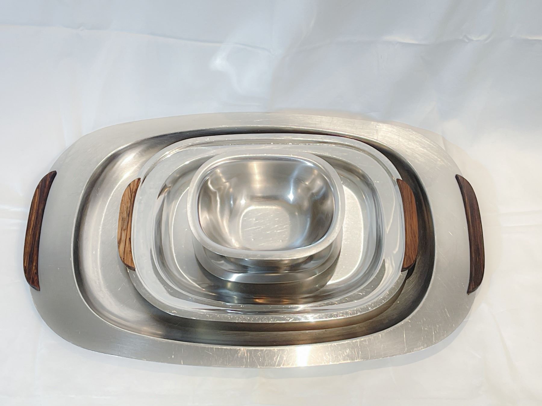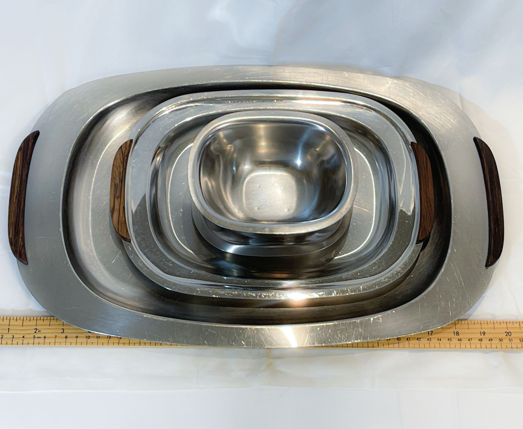 High-quality Danish mid-century modern serving set by Anni & Bent Tofte. Includes 2 matching stainless steel & teak trays and 1 square bowl marked “18-8 Made in Denmark.” Largest platter approx. 19" wide. Clean lines, light wear, excellent vintage condition.