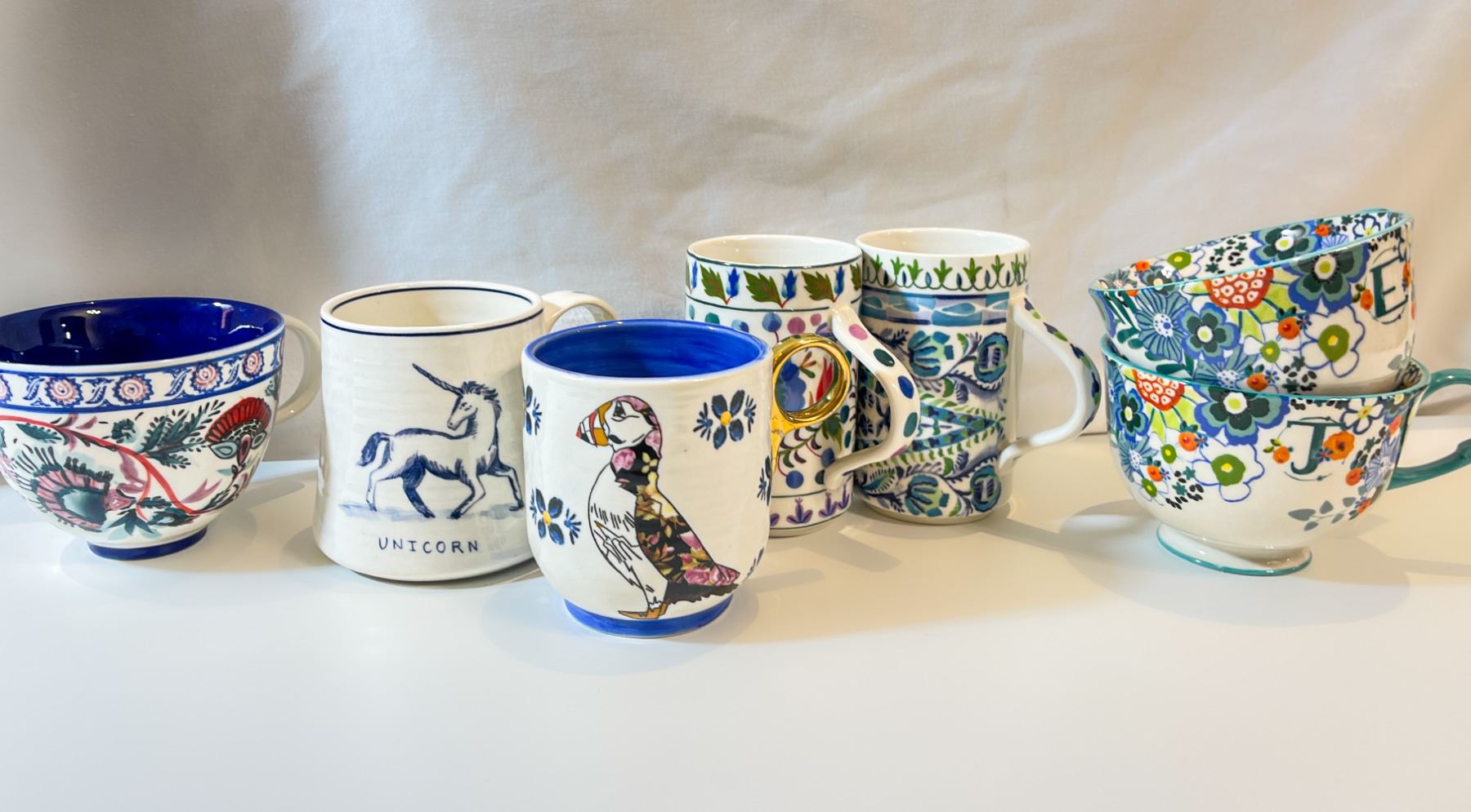 Beautiful large lot of collectible Anthropologie mugs and teacups featuring vibrant, hand-painted and illustrated designs. Includes the Unicorn mug by Molly Hatch and Puffin mug by Lee Page Hanson, along with other richly patterned and floral pieces in signature Anthropologie style. All in very good condition—ideal for collectors or as a cheerful eclectic set.