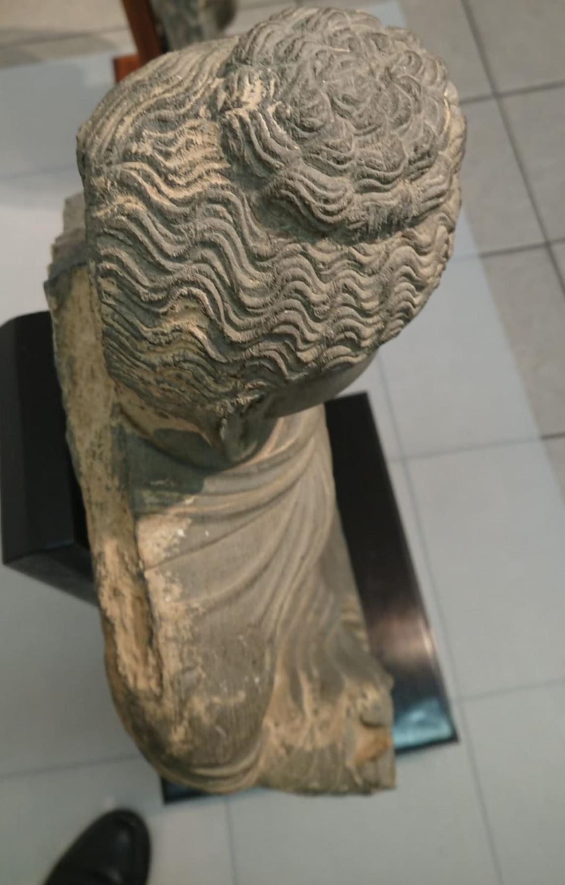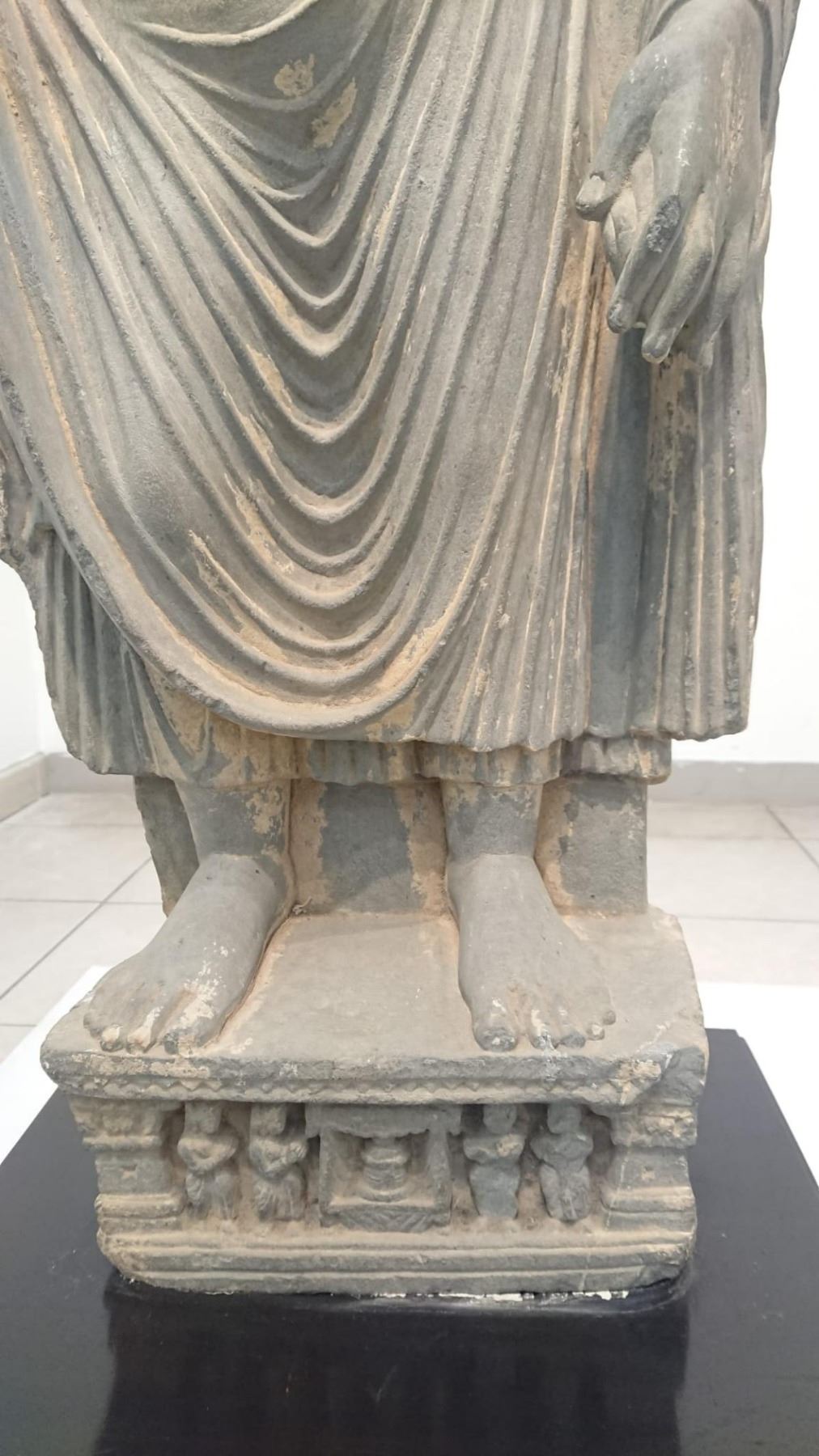 Title: Standing Buddha;Date: ca. 3rd century;Culture:Height 88 CM & width 34 CM; Pakistan (ancient region of Gandhara)Medium: Schist;This particular standing Buddha is one that is associated with the Gandharan appearance. It was discovered from an archaeological site which is in modern day Pakistan. The standing Gandharan Buddha has a European face and is clothed in Roman drapery. Gandhara was settled by Greeks due to the conquest of Alexander the Great in 327 BC. Although this subject matter is Buddhist, Alexander's reign gave this version a Roman look.This standing Buddha associated with the Gandharan school of Buddhism is unlike any other Buddhist sculpture ever created. It was made by sculpting slate, schist, or stucco. The ancient sculpting tools used to create this Buddha gave it some unique details that set it apart from other versions of Buddha. The almond shaped eyes appear downward and are centered by an urna. The Gandharan Buddha also serves as the first anthropomorphic Buddha ever created. Though different than earlier forms, this version reached a high popularity among believers due to its Hellenistic Greek style. Another Greek element incorporated into the making of this Buddha was the attention to detail.