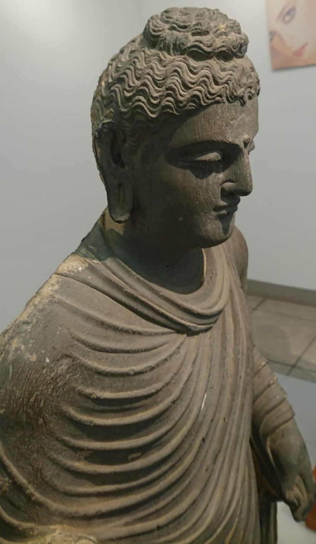 Title: Standing Buddha;Date: ca. 3rd century;Culture:Height 88 CM & width 34 CM; Pakistan (ancient region of Gandhara)Medium: Schist;This particular standing Buddha is one that is associated with the Gandharan appearance. It was discovered from an archaeological site which is in modern day Pakistan. The standing Gandharan Buddha has a European face and is clothed in Roman drapery. Gandhara was settled by Greeks due to the conquest of Alexander the Great in 327 BC. Although this subject matter is Buddhist, Alexander's reign gave this version a Roman look.This standing Buddha associated with the Gandharan school of Buddhism is unlike any other Buddhist sculpture ever created. It was made by sculpting slate, schist, or stucco. The ancient sculpting tools used to create this Buddha gave it some unique details that set it apart from other versions of Buddha. The almond shaped eyes appear downward and are centered by an urna. The Gandharan Buddha also serves as the first anthropomorphic Buddha ever created. Though different than earlier forms, this version reached a high popularity among believers due to its Hellenistic Greek style. Another Greek element incorporated into the making of this Buddha was the attention to detail.