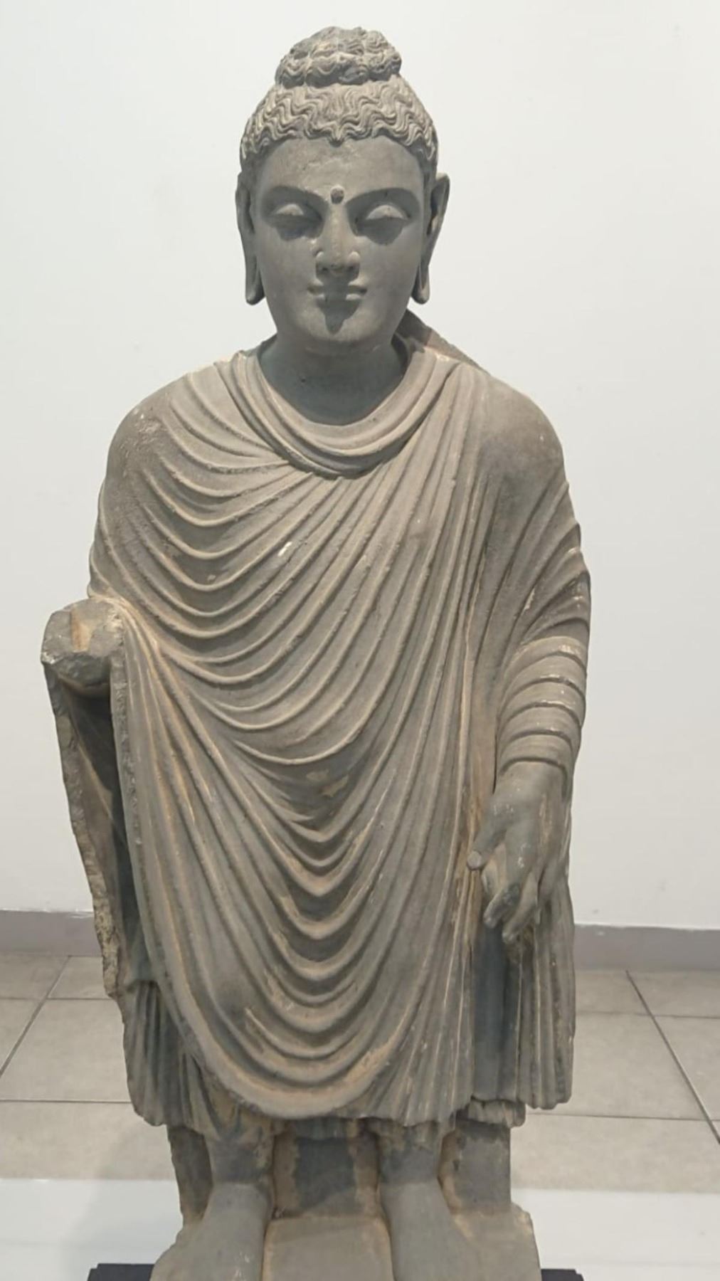 Title: Standing Buddha;Date: ca. 3rd century;Culture:Height 88 CM & width 34 CM; Pakistan (ancient region of Gandhara)Medium: Schist;This particular standing Buddha is one that is associated with the Gandharan appearance. It was discovered from an archaeological site which is in modern day Pakistan. The standing Gandharan Buddha has a European face and is clothed in Roman drapery. Gandhara was settled by Greeks due to the conquest of Alexander the Great in 327 BC. Although this subject matter is Buddhist, Alexander's reign gave this version a Roman look.This standing Buddha associated with the Gandharan school of Buddhism is unlike any other Buddhist sculpture ever created. It was made by sculpting slate, schist, or stucco. The ancient sculpting tools used to create this Buddha gave it some unique details that set it apart from other versions of Buddha. The almond shaped eyes appear downward and are centered by an urna. The Gandharan Buddha also serves as the first anthropomorphic Buddha ever created. Though different than earlier forms, this version reached a high popularity among believers due to its Hellenistic Greek style. Another Greek element incorporated into the making of this Buddha was the attention to detail.
