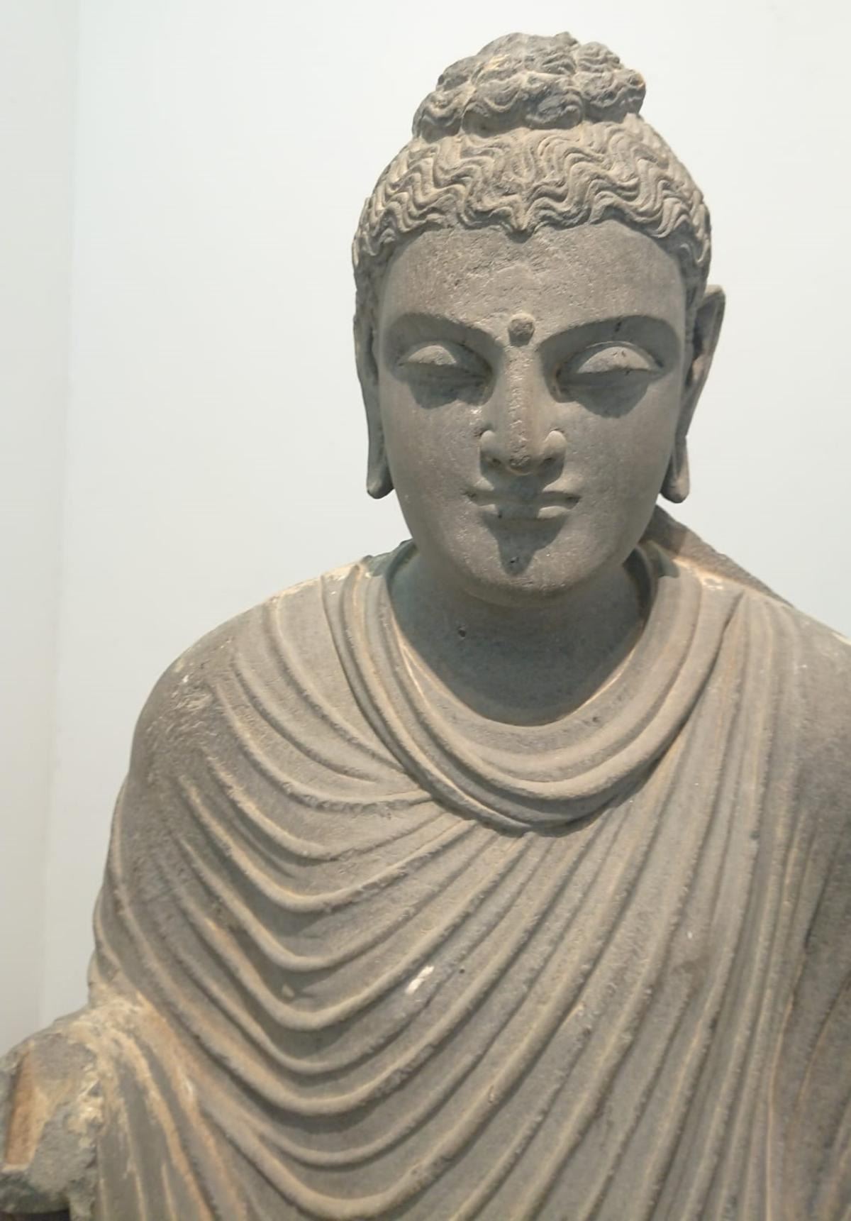 Title: Standing Buddha;Date: ca. 3rd century;Culture:Height 88 CM & width 34 CM; Pakistan (ancient region of Gandhara)Medium: Schist;This particular standing Buddha is one that is associated with the Gandharan appearance. It was discovered from an archaeological site which is in modern day Pakistan. The standing Gandharan Buddha has a European face and is clothed in Roman drapery. Gandhara was settled by Greeks due to the conquest of Alexander the Great in 327 BC. Although this subject matter is Buddhist, Alexander's reign gave this version a Roman look.This standing Buddha associated with the Gandharan school of Buddhism is unlike any other Buddhist sculpture ever created. It was made by sculpting slate, schist, or stucco. The ancient sculpting tools used to create this Buddha gave it some unique details that set it apart from other versions of Buddha. The almond shaped eyes appear downward and are centered by an urna. The Gandharan Buddha also serves as the first anthropomorphic Buddha ever created. Though different than earlier forms, this version reached a high popularity among believers due to its Hellenistic Greek style. Another Greek element incorporated into the making of this Buddha was the attention to detail.
