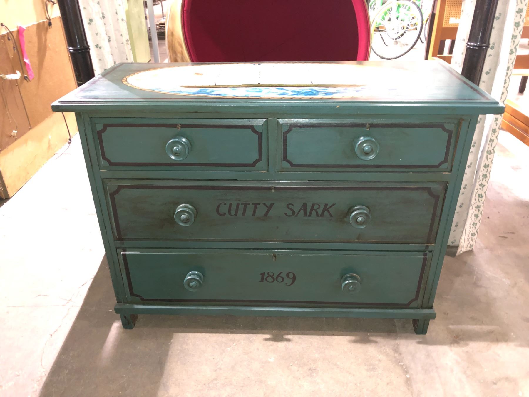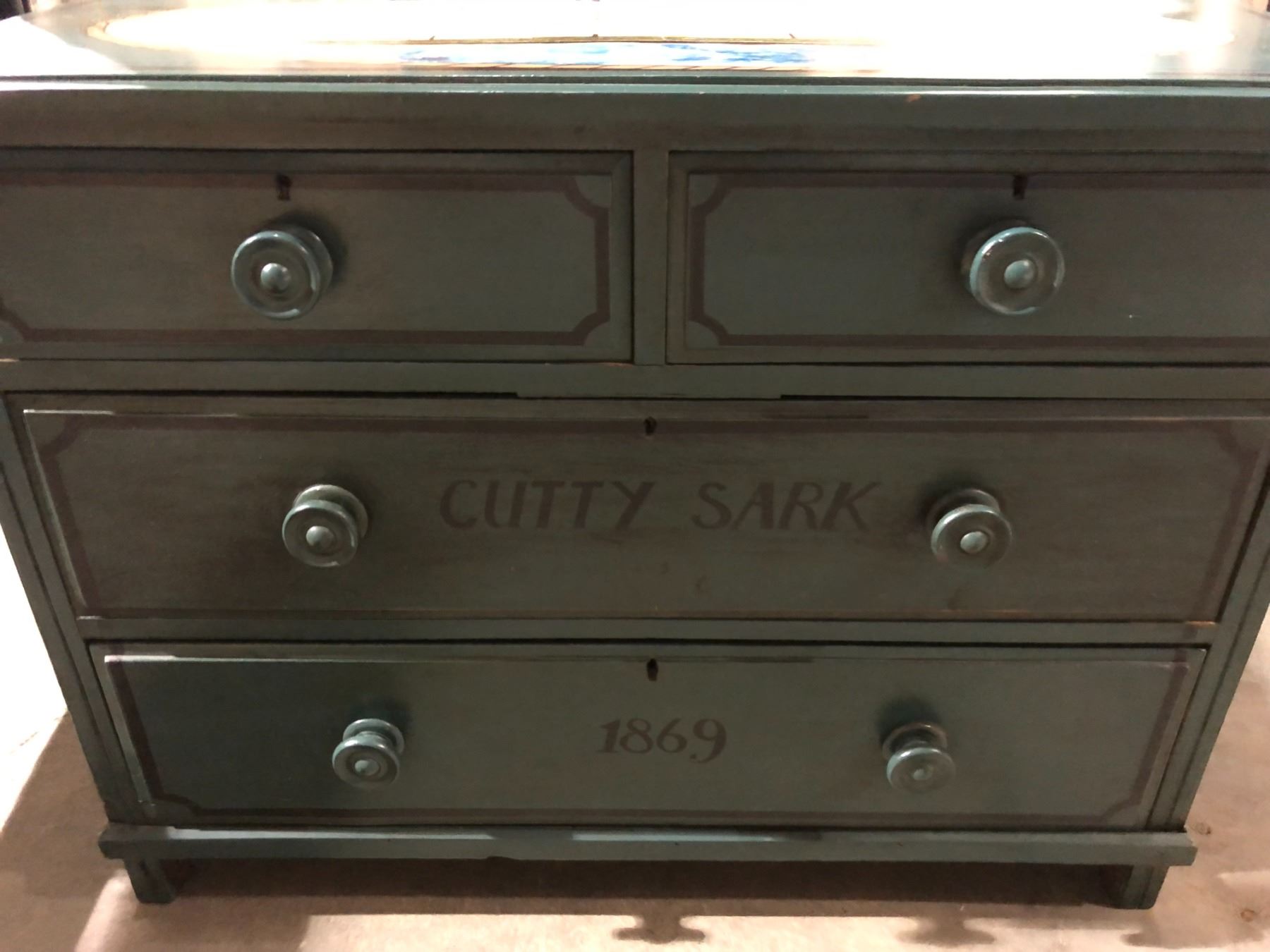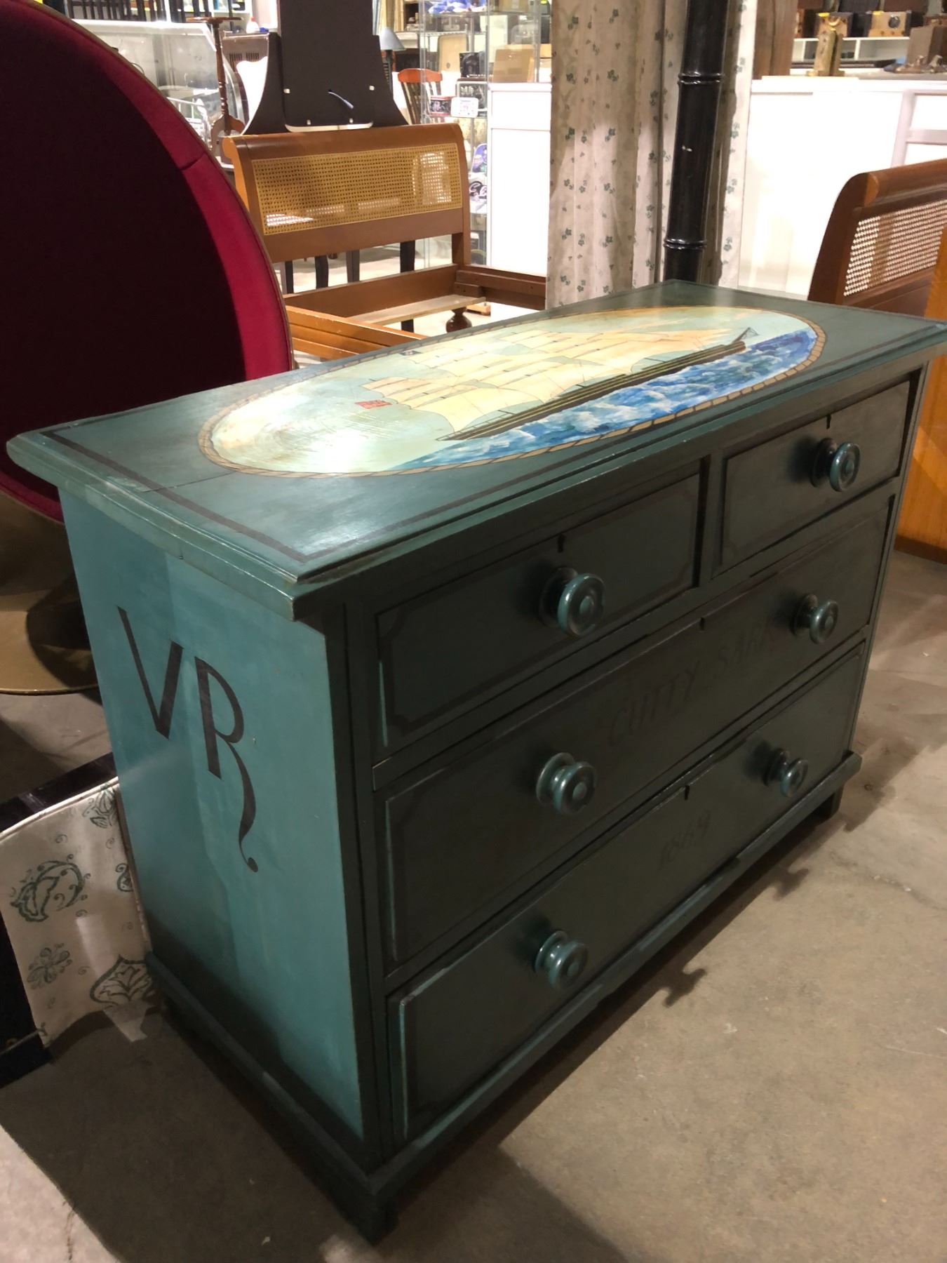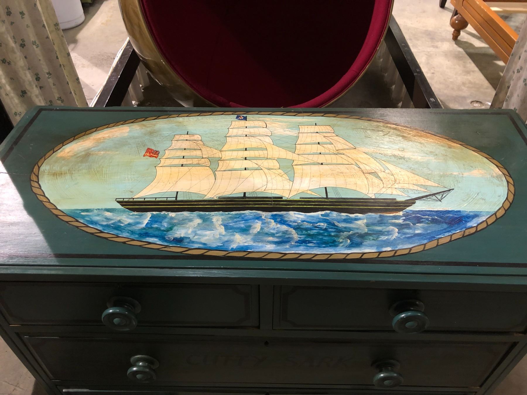 Antique 4 drawer low boy dresser w/ painted Cutty Sark 1869 nautical sailing ship motif - comes w/ key