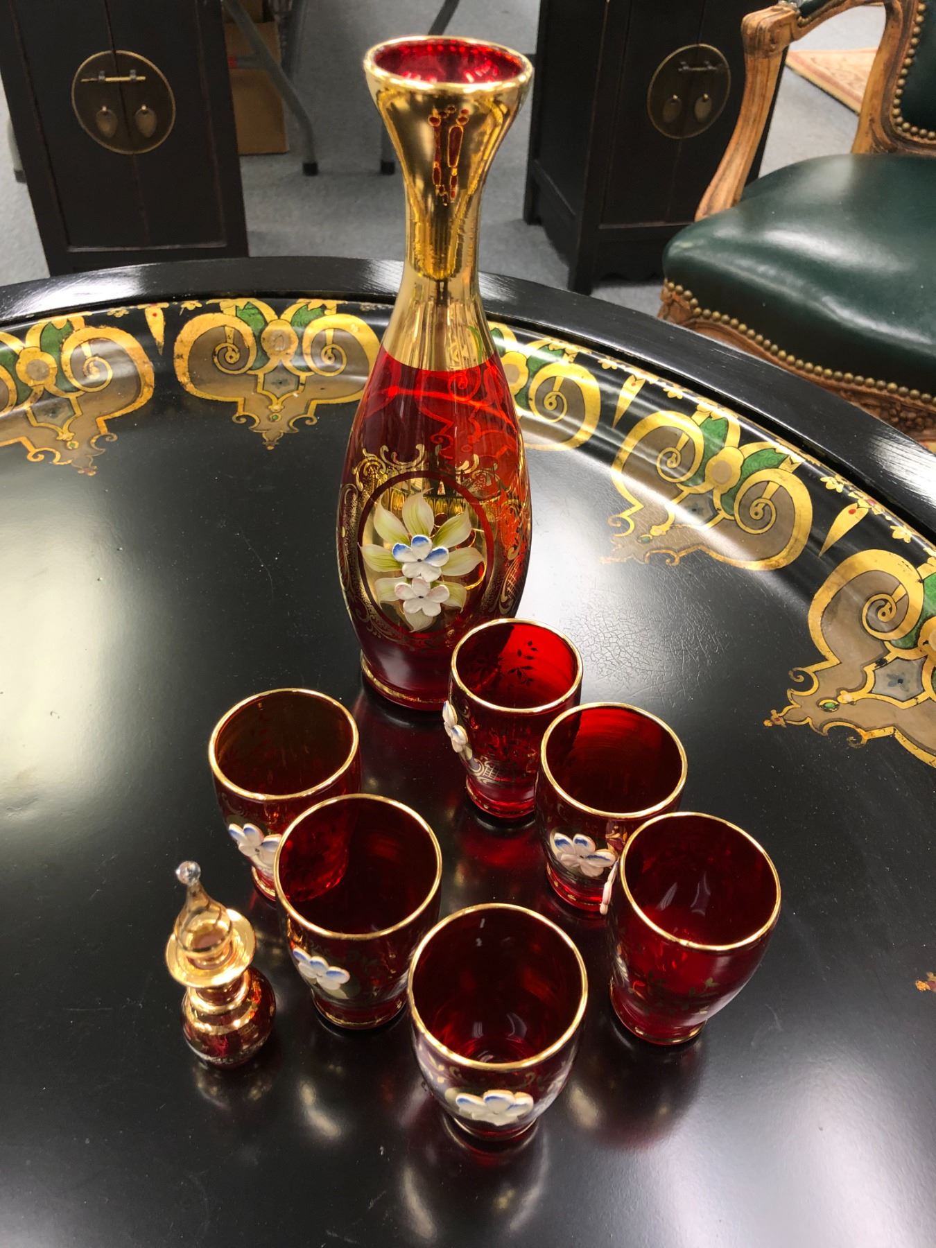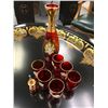 Antique 7 pc. ruby glass w/ gold trim decanter & glass set & small perfume bottle
