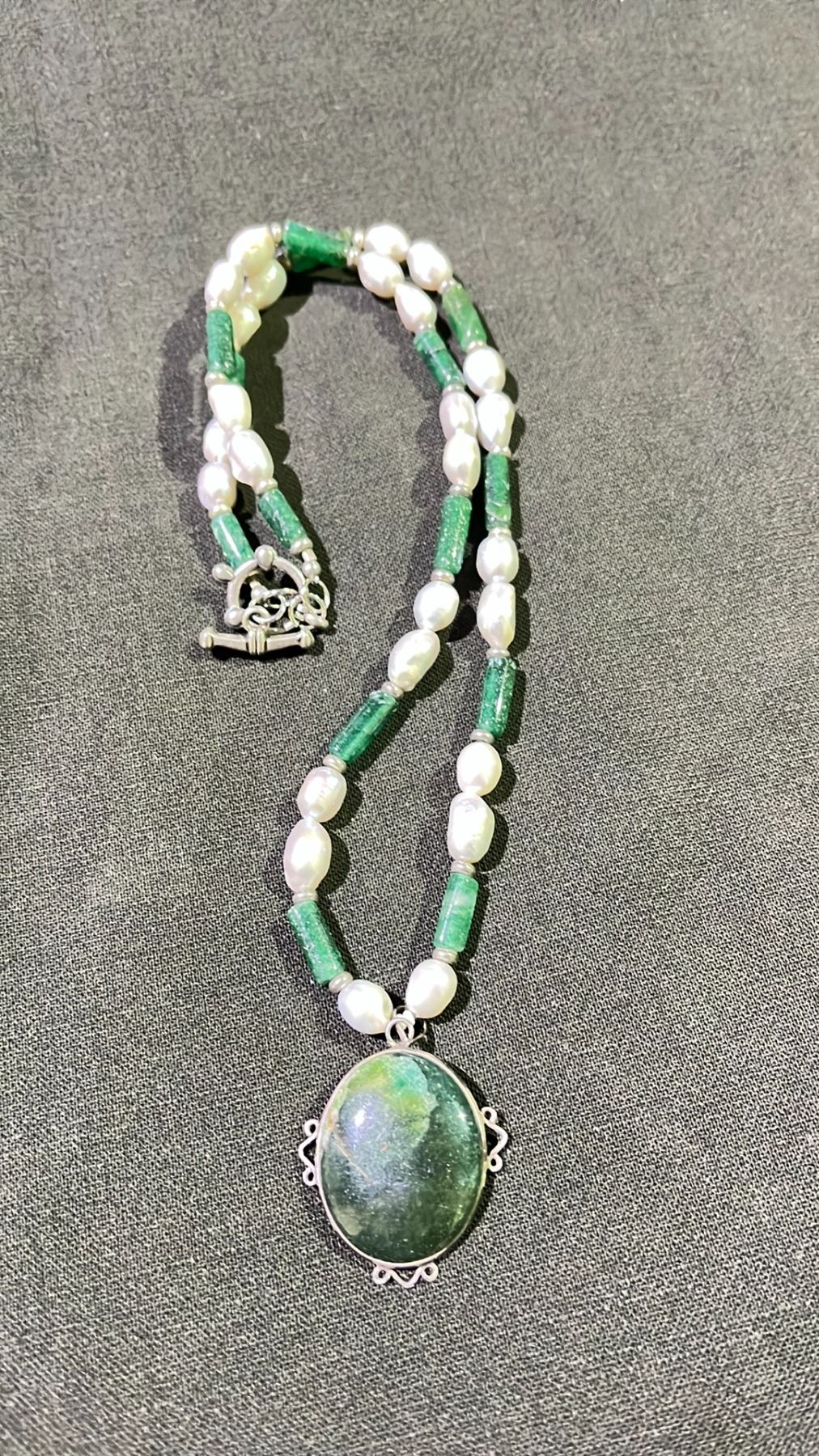 Antique 925 Pearl Jade Emerald Bead Necklace