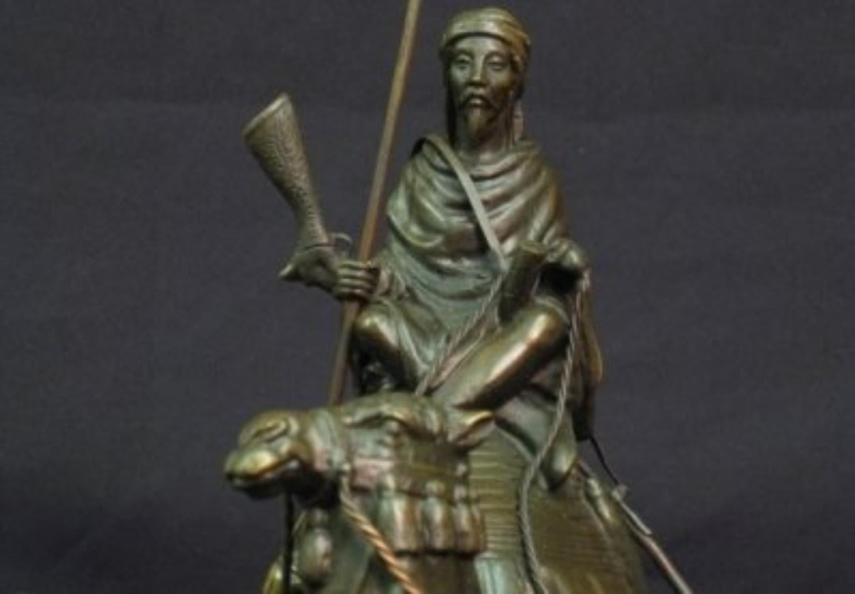 Antique Arab (Muslim) Warrior Sculpture......A stunning bronze sculpture of a bedouin warrior with spear and rifle riding his ship of the desert;Height 15.0 x Width 9.4 x Depth 6.7 inches Weight 14.3 lbs.