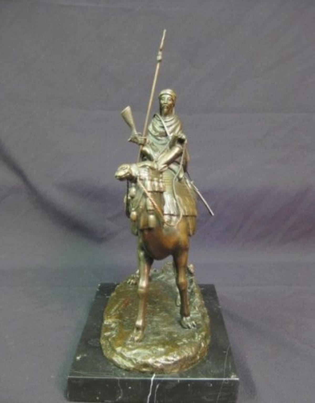 Antique Arab (Muslim) Warrior Sculpture......A stunning bronze sculpture of a bedouin warrior with spear and rifle riding his ship of the desert;Height 15.0 x Width 9.4 x Depth 6.7 inches Weight 14.3 lbs.
