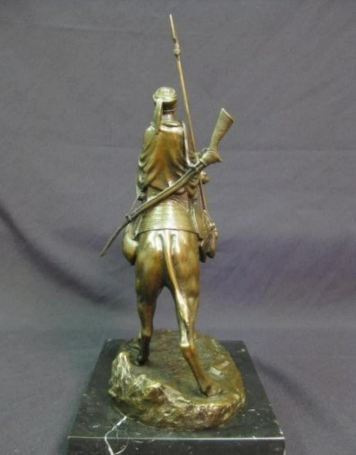 Antique Arab (Muslim) Warrior Sculpture......A stunning bronze sculpture of a bedouin warrior with spear and rifle riding his ship of the desert;Height 15.0 x Width 9.4 x Depth 6.7 inches & amp; Weight 14.3 lbs.