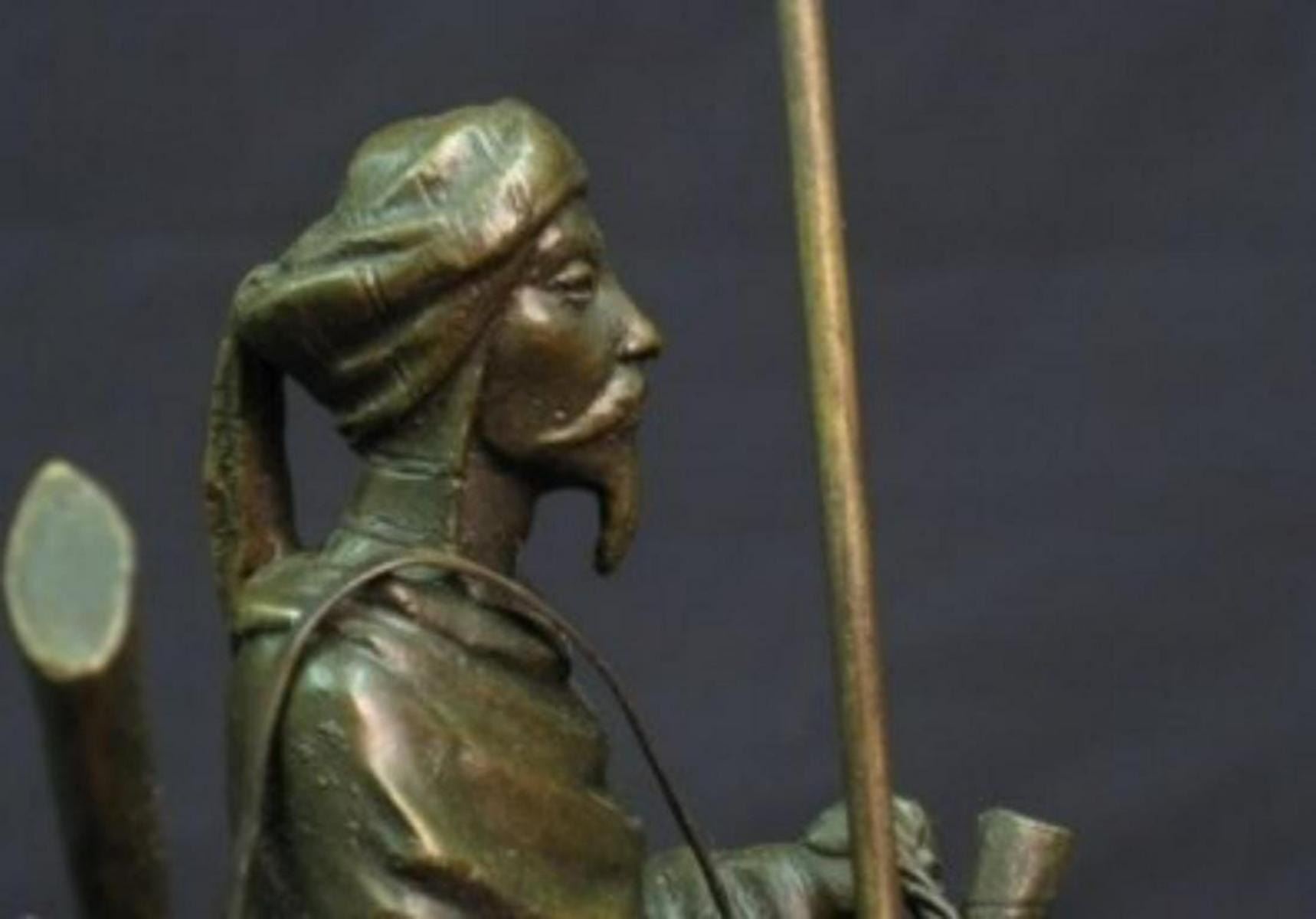 Antique Arab (Muslim) Warrior Sculpture......A stunning bronze sculpture of a bedouin warrior with spear and rifle riding his ship of the desert;Height 15.0 x Width 9.4 x Depth 6.7 inches & amp; Weight 14.3 lbs.