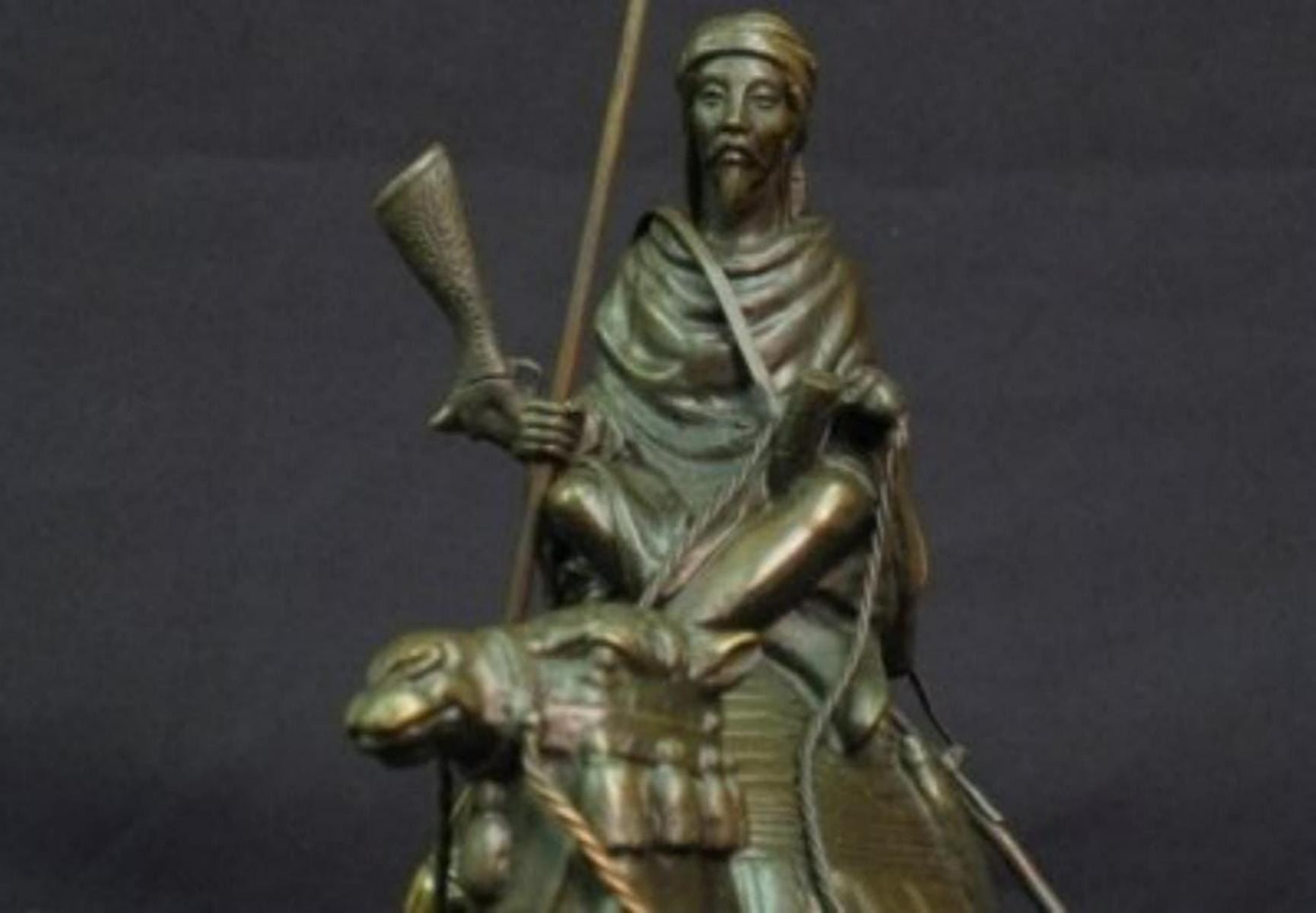 Antique Arab (Muslim) Warrior Sculpture......A stunning bronze sculpture of a bedouin warrior with spear and rifle riding his ship of the desert;Height 15.0 x Width 9.4 x Depth 6.7 inches & amp; Weight 14.3 lbs.