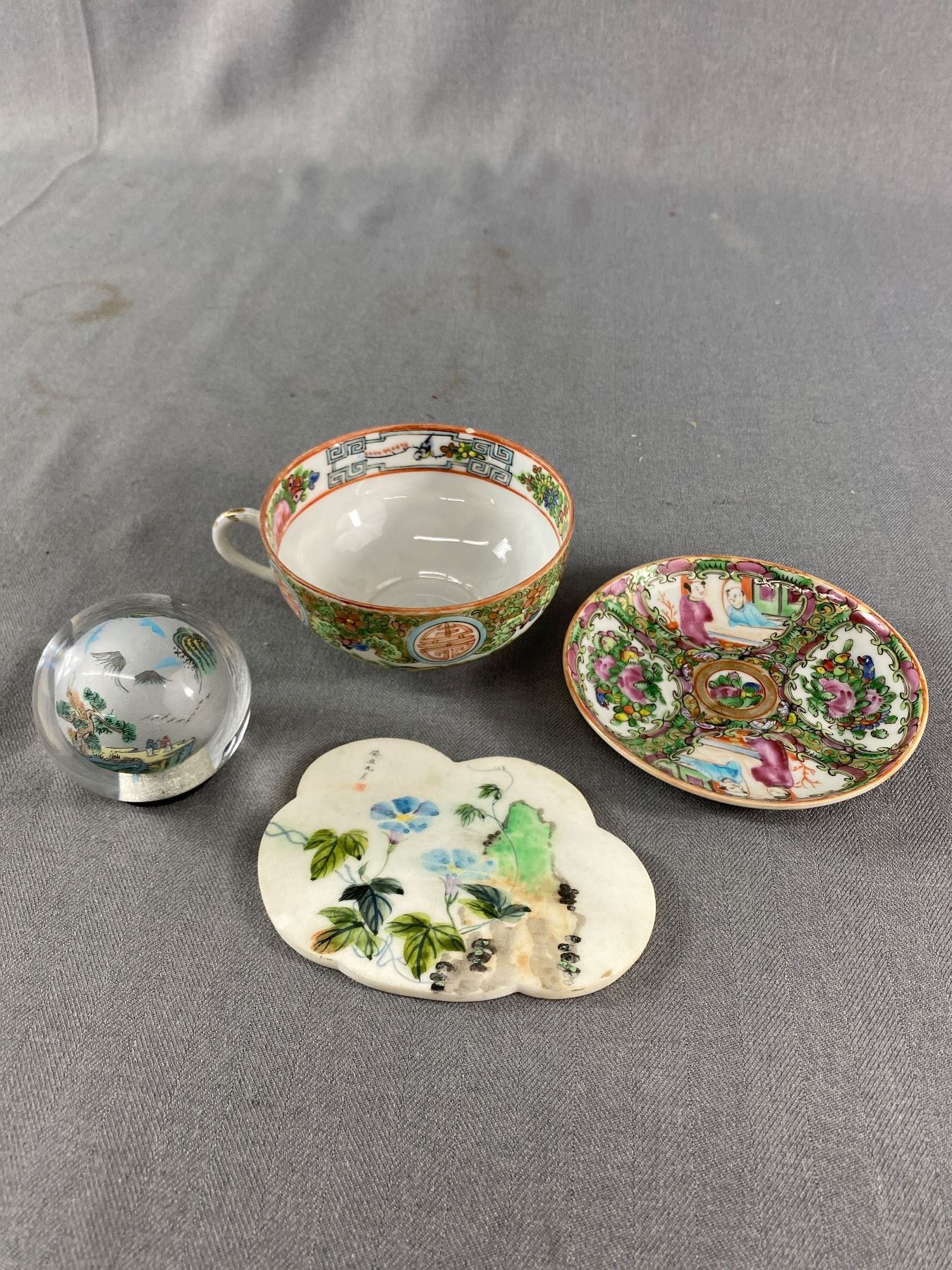 Antique Asian Eggshell Porcelain Cup,Saucer, Signed Hand Painted Soapstone & Reverse Painted Paperweight