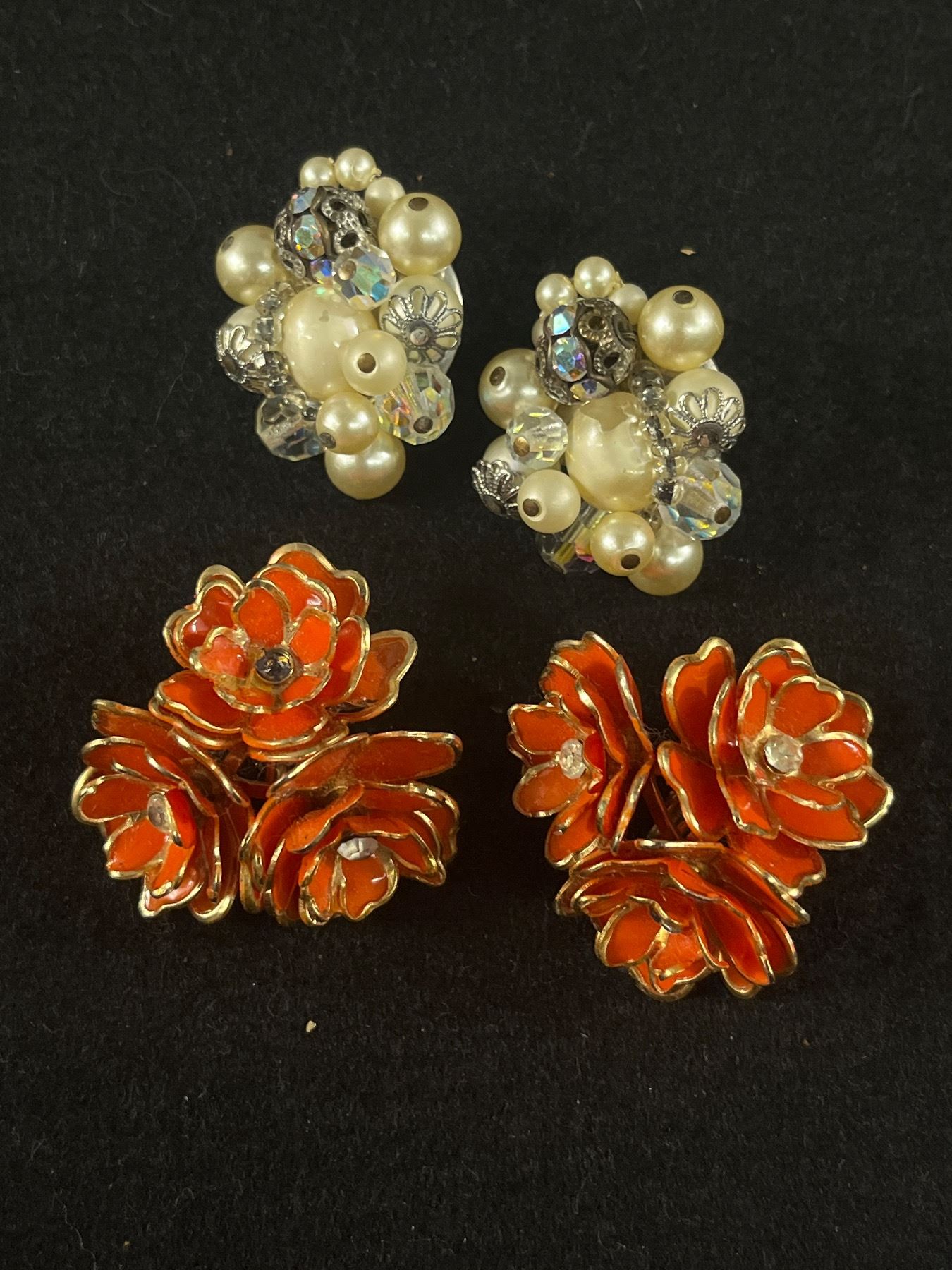 Antique Celluloid Flower Earrings & Pearl Crystal Earrings