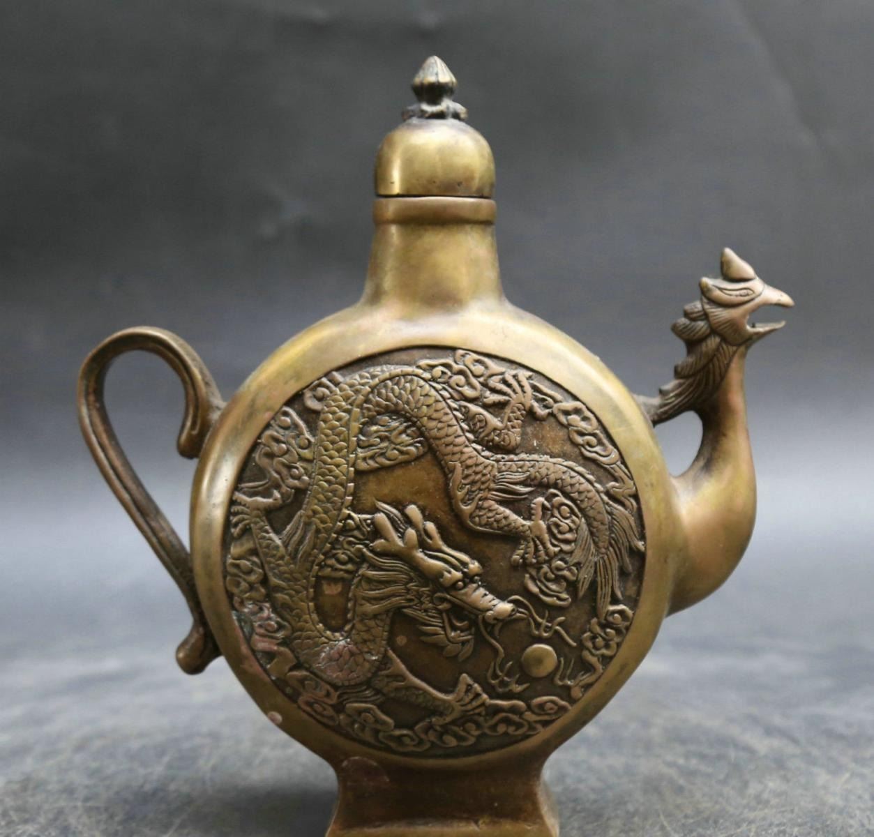 Antique Chinese Brass Auspicious Dragon & Phoenix Pot......Material: Brass;Size: Long: 7.9". Width : 7.1". Height : 2.2"Weight: 828 Grams; Origin - China